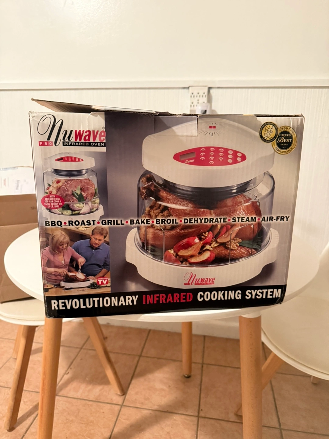 I'm selling a brand new NuWave Pro Infrared Oven, still in its original box! It's a revolutionary infrared cooking system that lets you BBQ, roast, grill, bake, broil, dehydrate, steam, and air-fry. Enjoy great tasting food naturally and reduce the amount of fat in your cooking. Comes with the quick and easy cooking guide