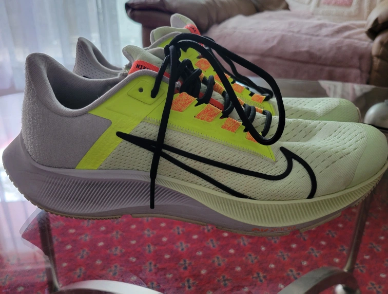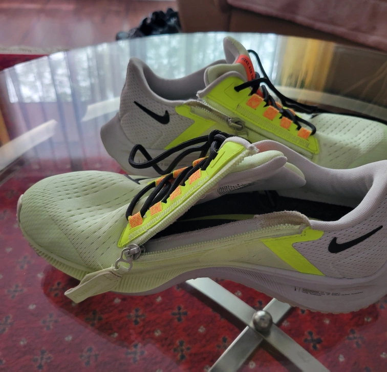 Selling a pair of Nike Air Zoom Pegasus 38 FlyEase running shoes in US size 9.5 Unisex. .The colour is a mix of grey, light green and neon yellow. The model number is DA6674-700. They feature a zipper for easy on and off. Great for running or everyday wear!