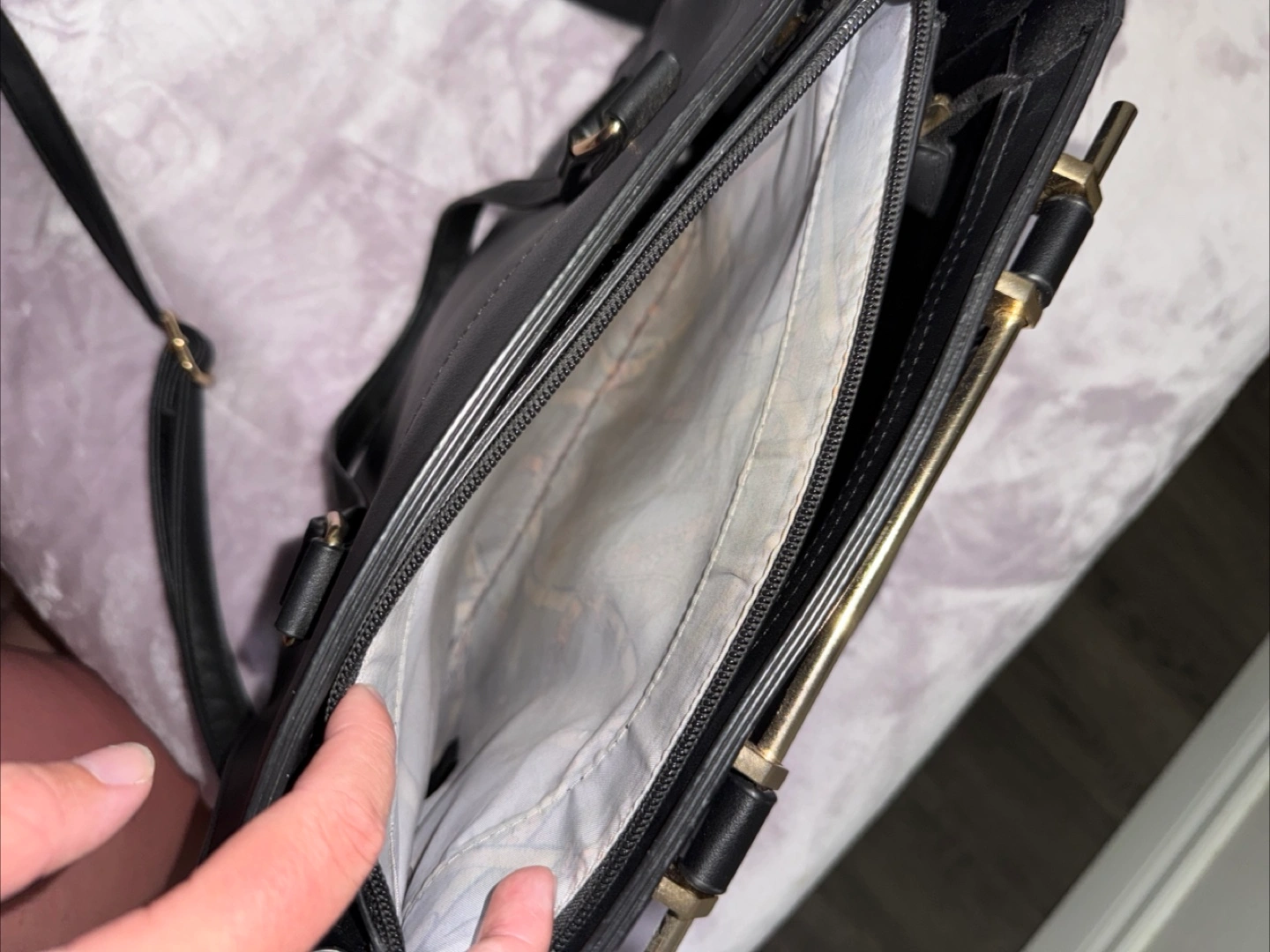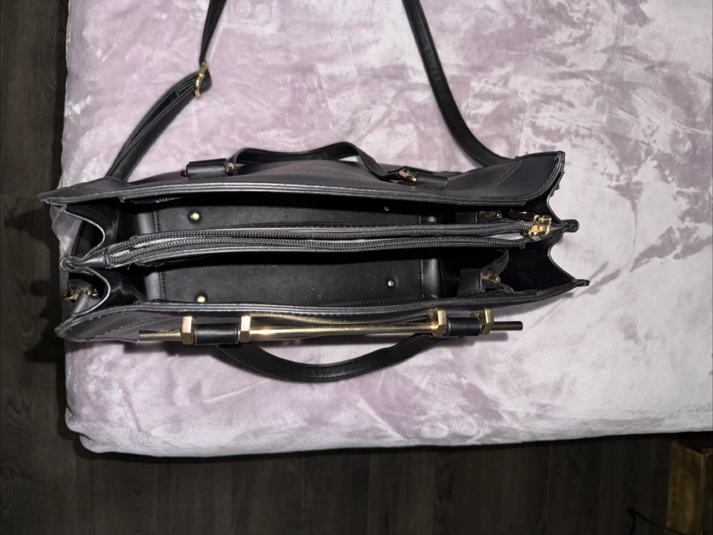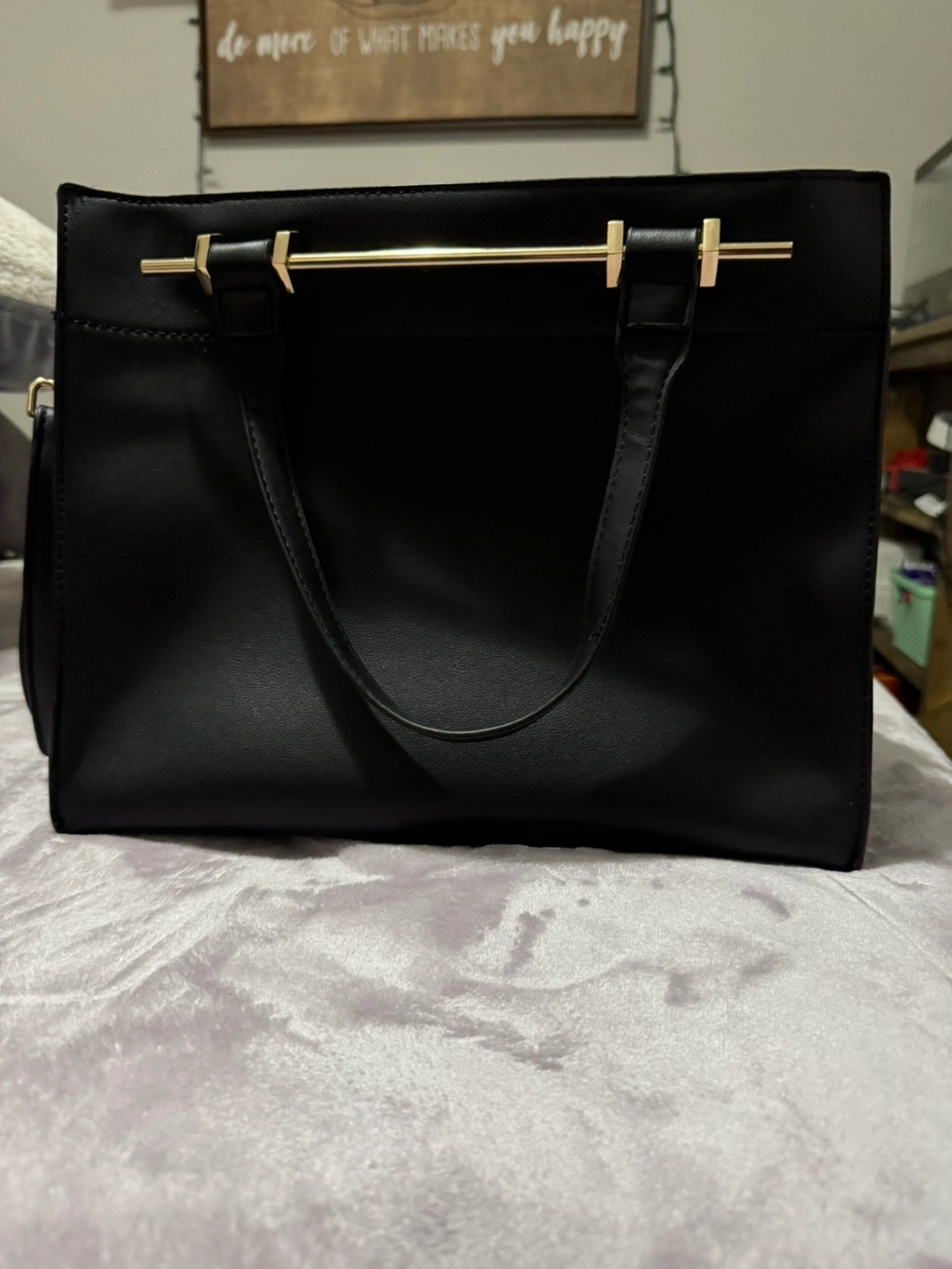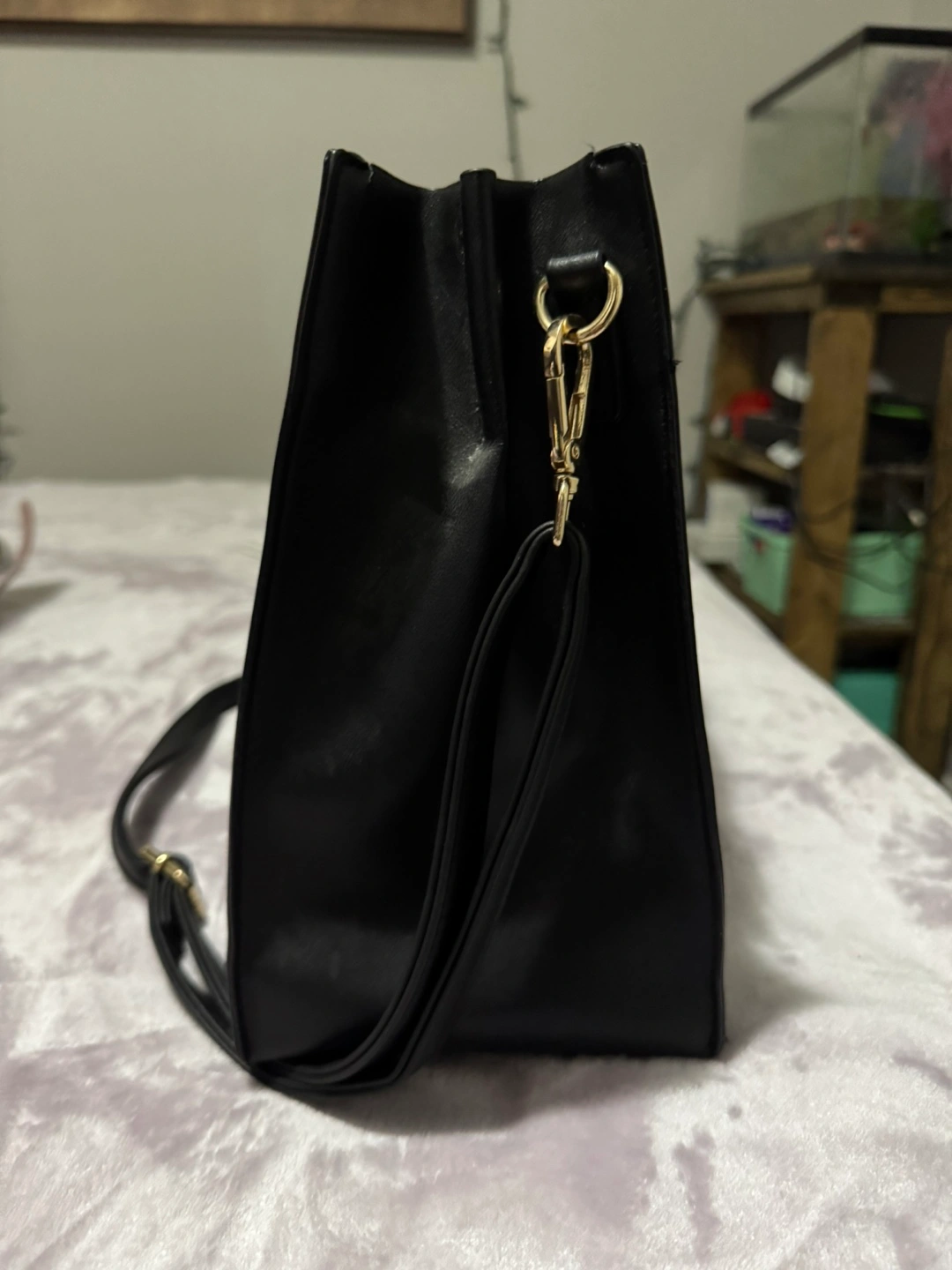Selling a black tote bag. It's in good condition and has a sleek, classic look. Perfect for carrying your everyday essentials!