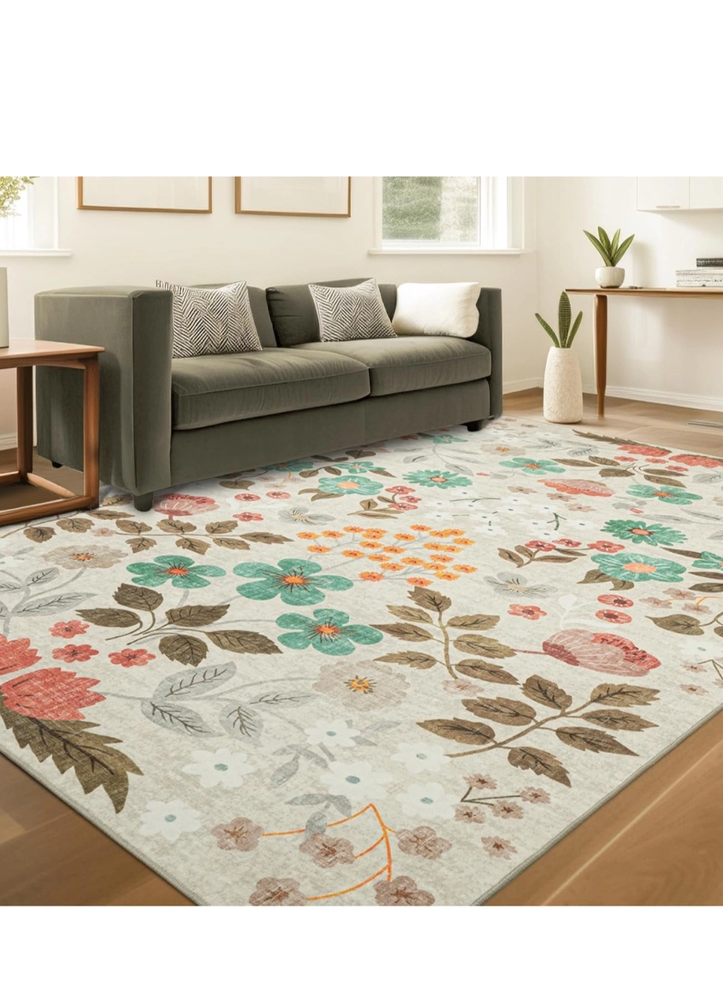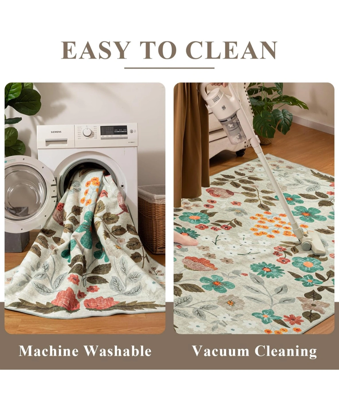 This is a beautiful floral area rug made of premium faux wool. It's easy to clean, machine washable, and can be vacuumed. The rug measures 8 ft x 10 ft (244 cm x 305 cm) and has an ultra-thin low pile of 0.24 inches / 0.6 cm