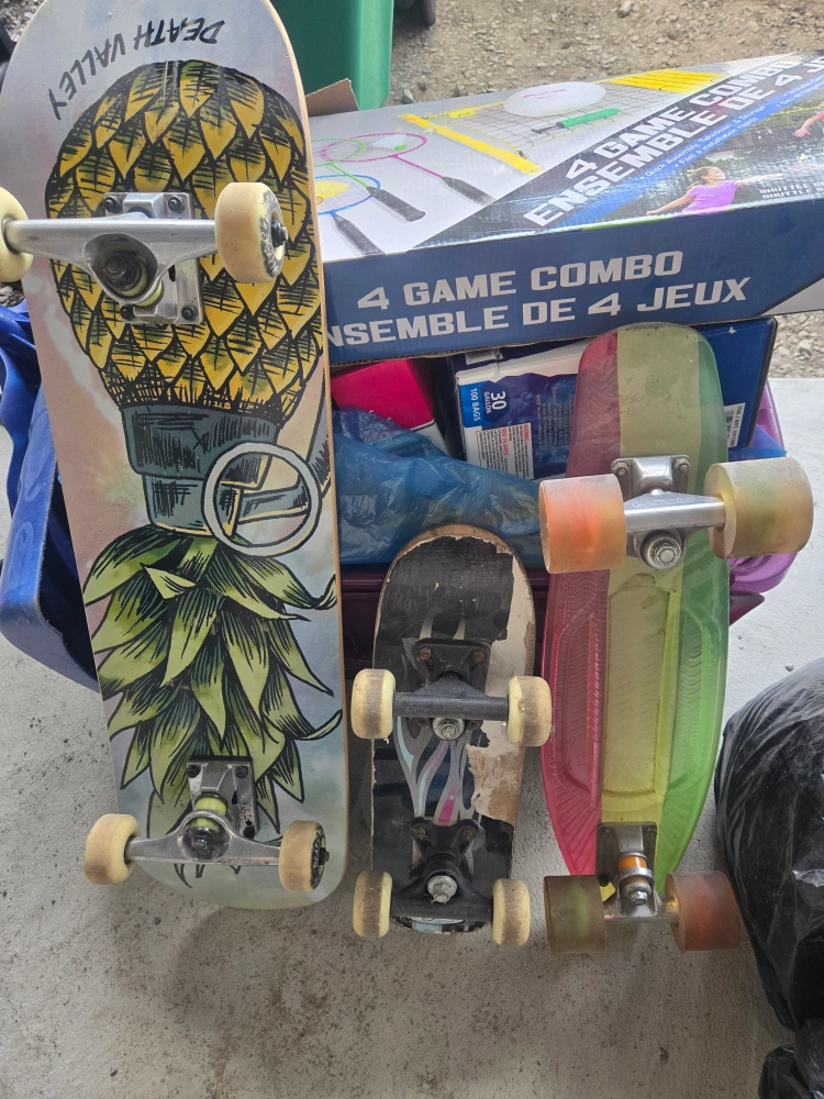 Selling a collection of three skateboards. One is a Death Valley board with a pineapple design, another is a Rawlings board, and the third is a cool rainbow-coloured board. All are used but still have life left in them!