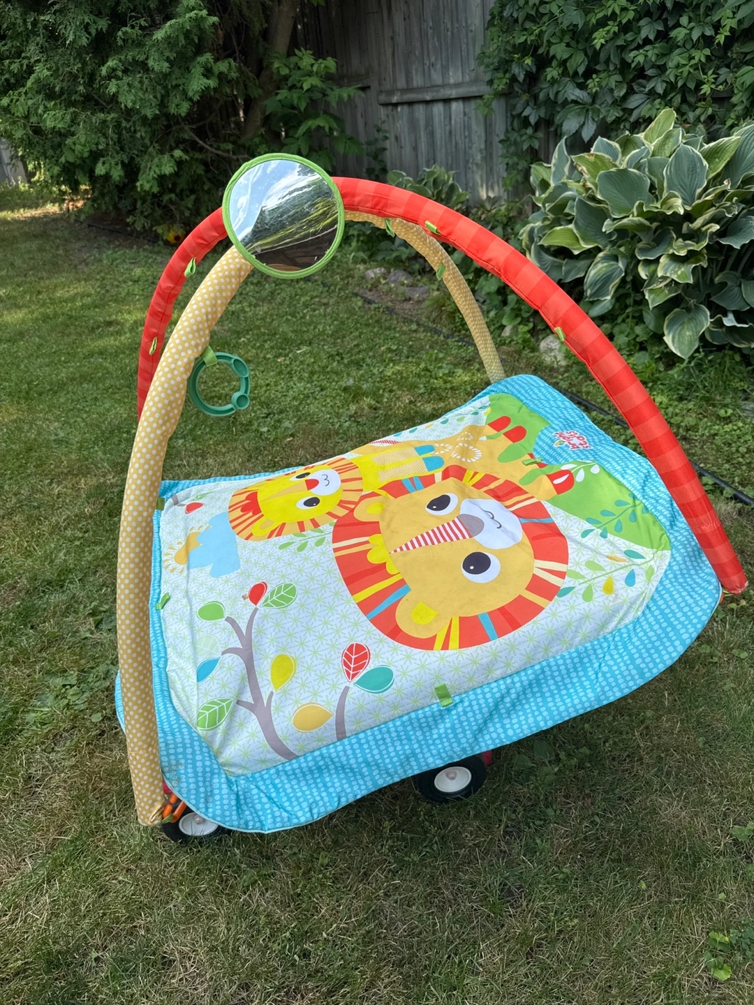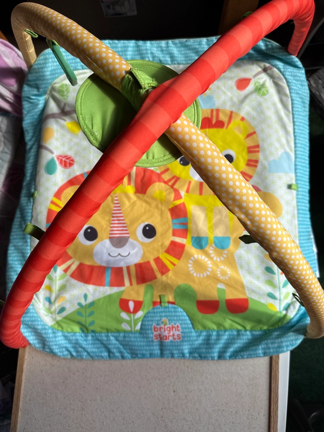 Here's a Bright Starts activity gym, perfect for your little one! It's in great shape and ready for a new home. The mat features adorable lion designs and includes a mirror and hanging toys to keep your baby entertained. Made for Kids II Inc.