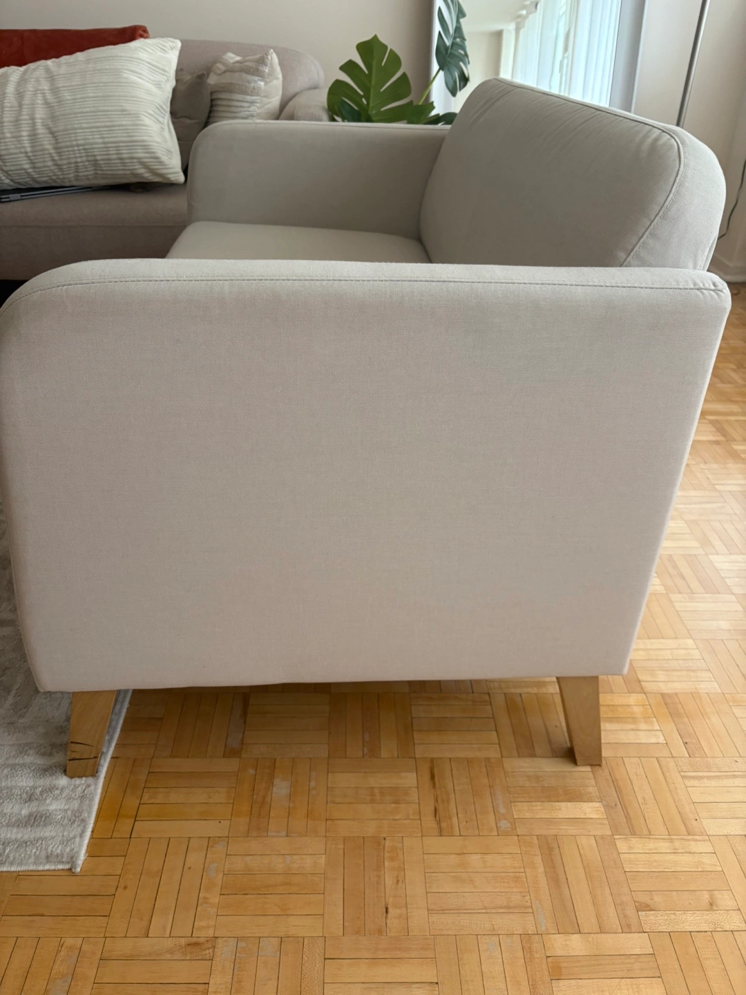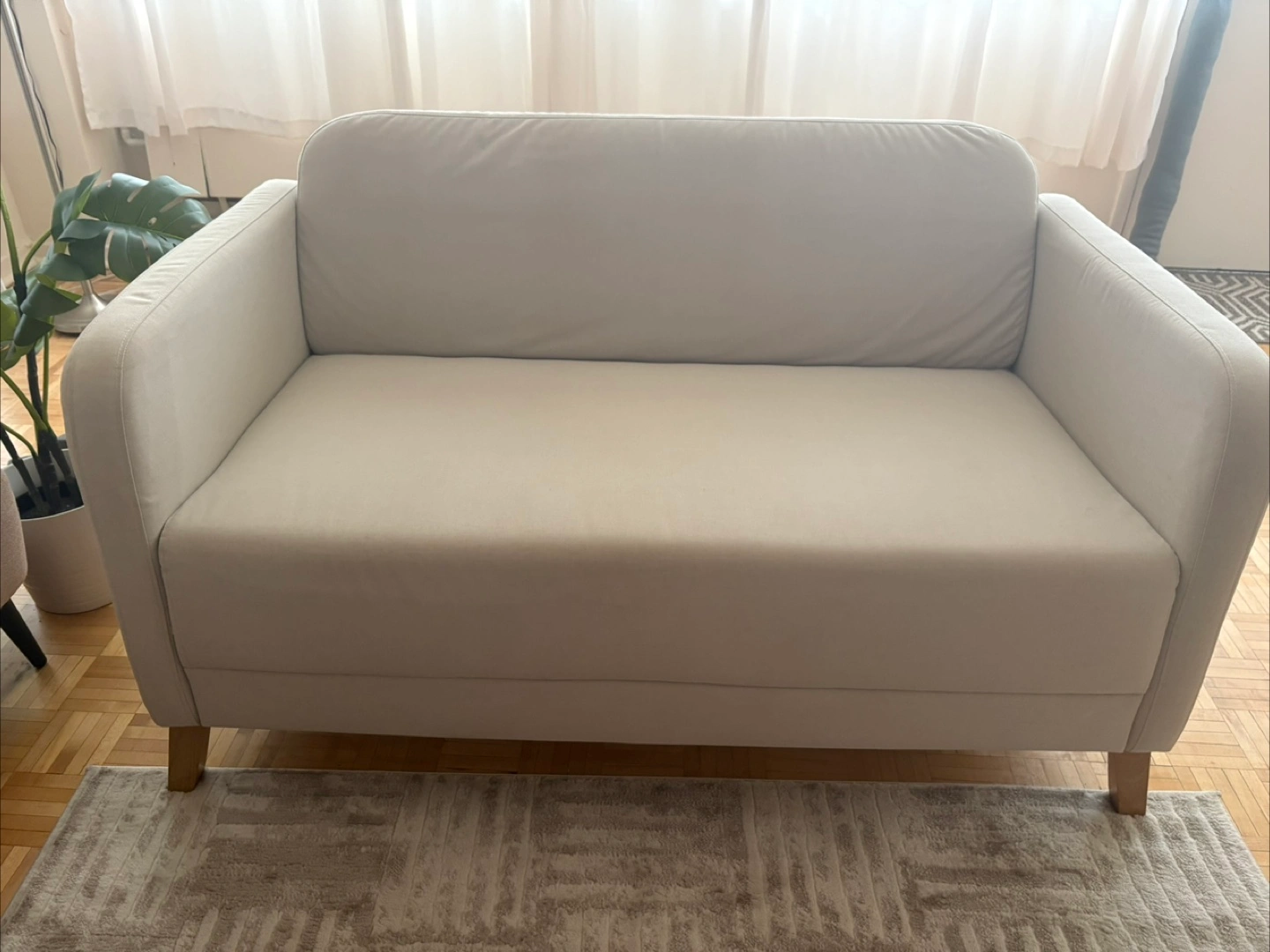 Selling a comfy loveseat sofa in a neutral beige colour! It's in great condition and would be a lovely addition to any living space. Perfect for small spaces or as extra seating in a larger room. Comes with a matching decorative pillow!