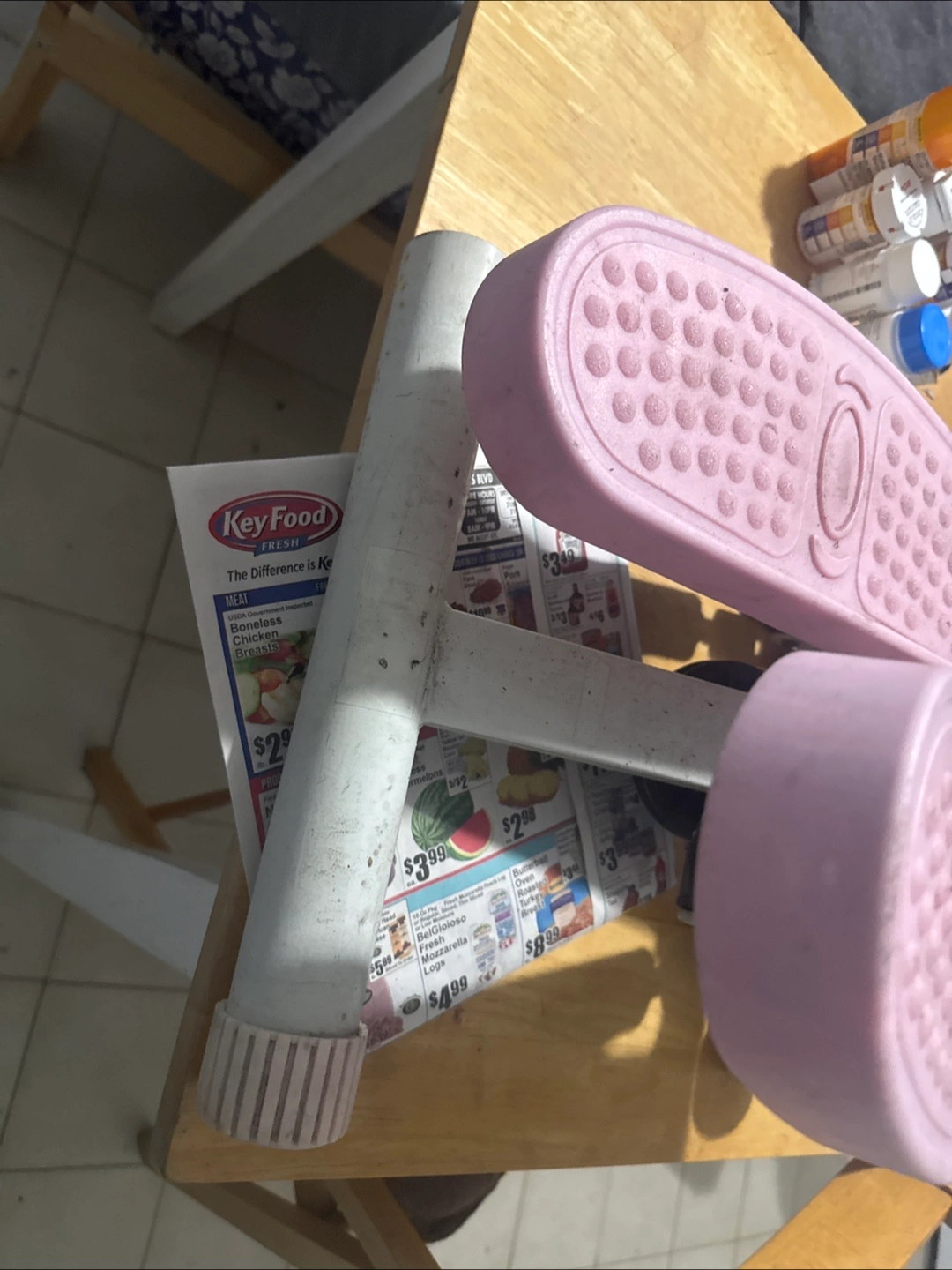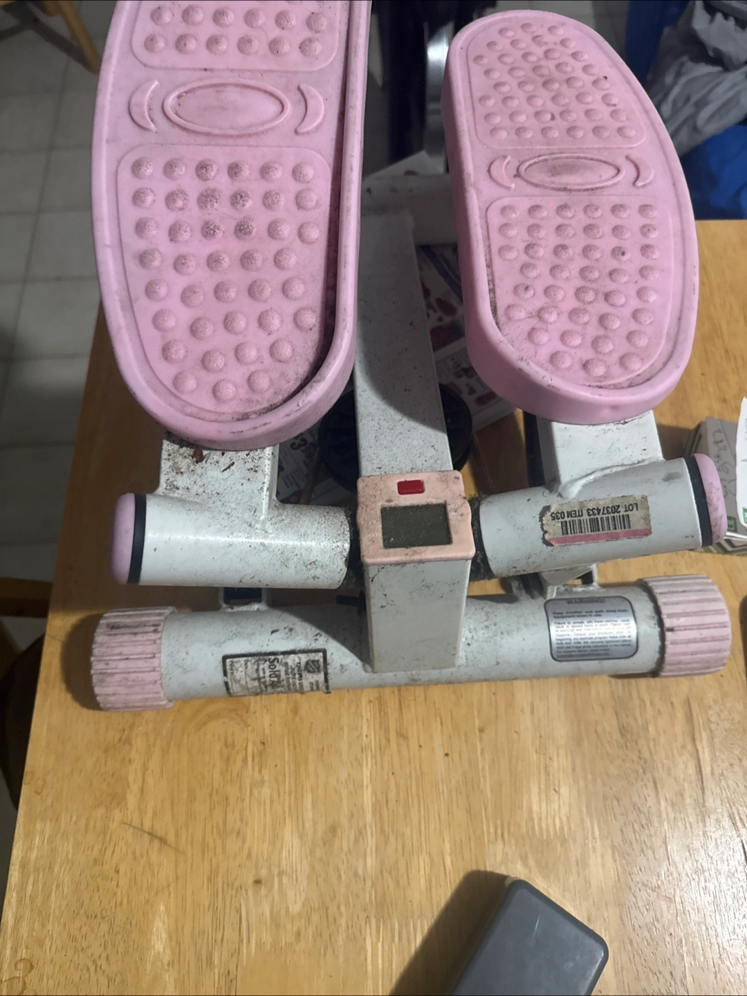 Selling a pink mini stepper exercise machine. It's a compact and convenient way to get some exercise at home. It shows signs of use but is still functional. Perfect for small spaces!