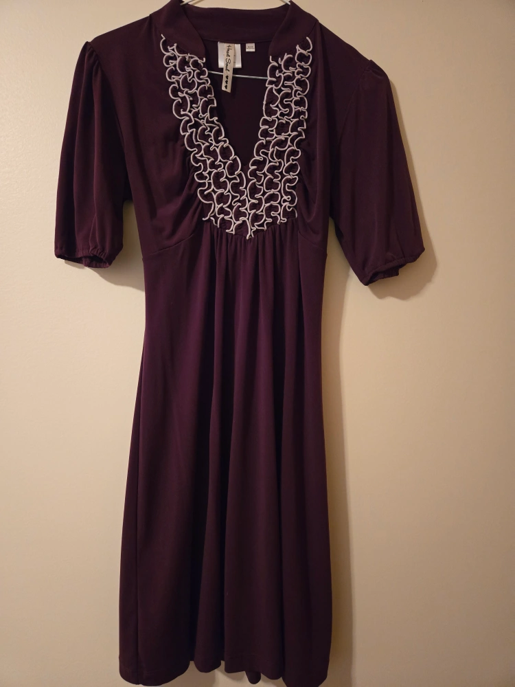 This is a Heart Soul dress in size small. It's a lovely dark purple colour with white detailing around the neckline. The material is 95% polyester and 5% spandex, making it comfortable and easy to wear