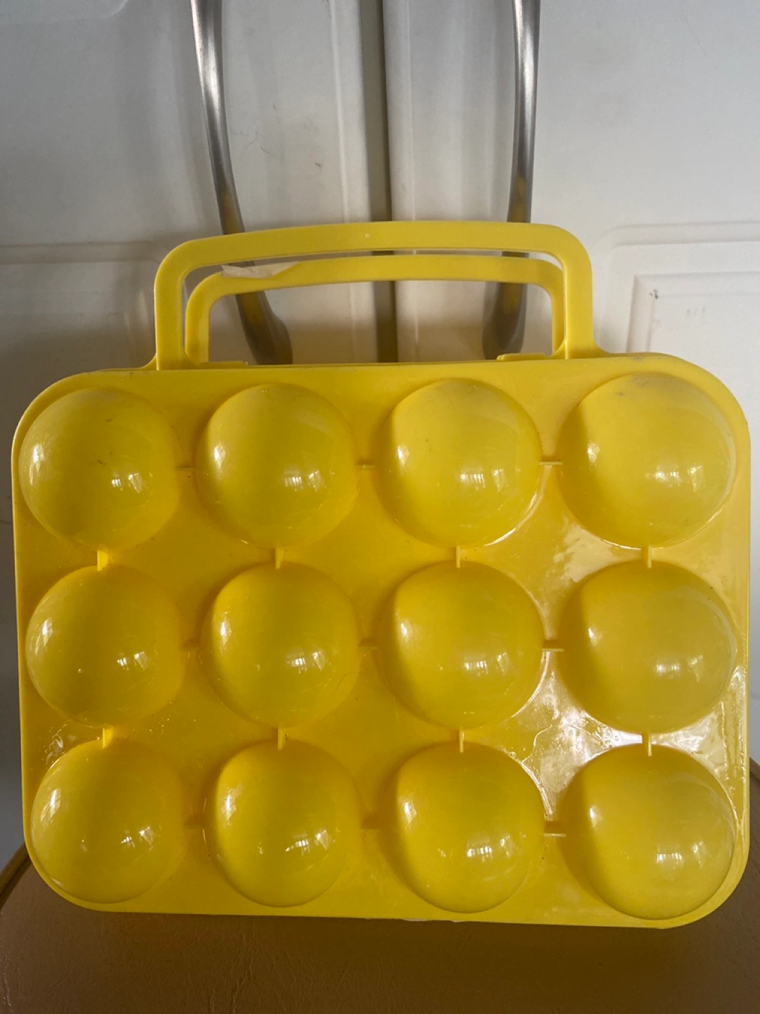 1000+Here's a bright yellow plastic egg carrier, perfect for transporting your eggs safely and securely! It holds a dozen eggs and has a convenient handle for easy carrying
