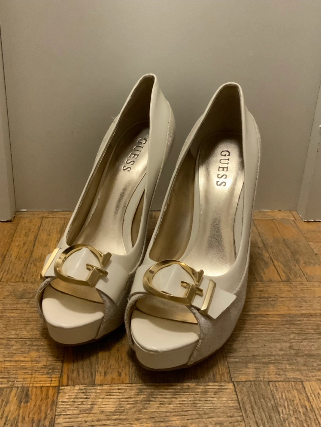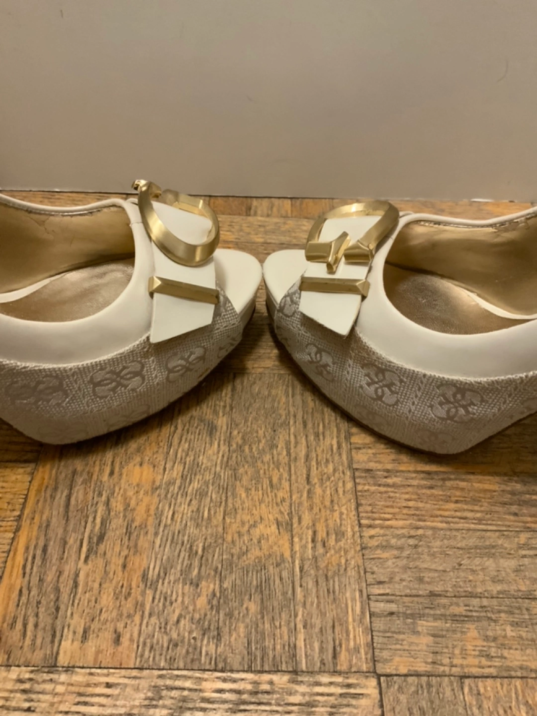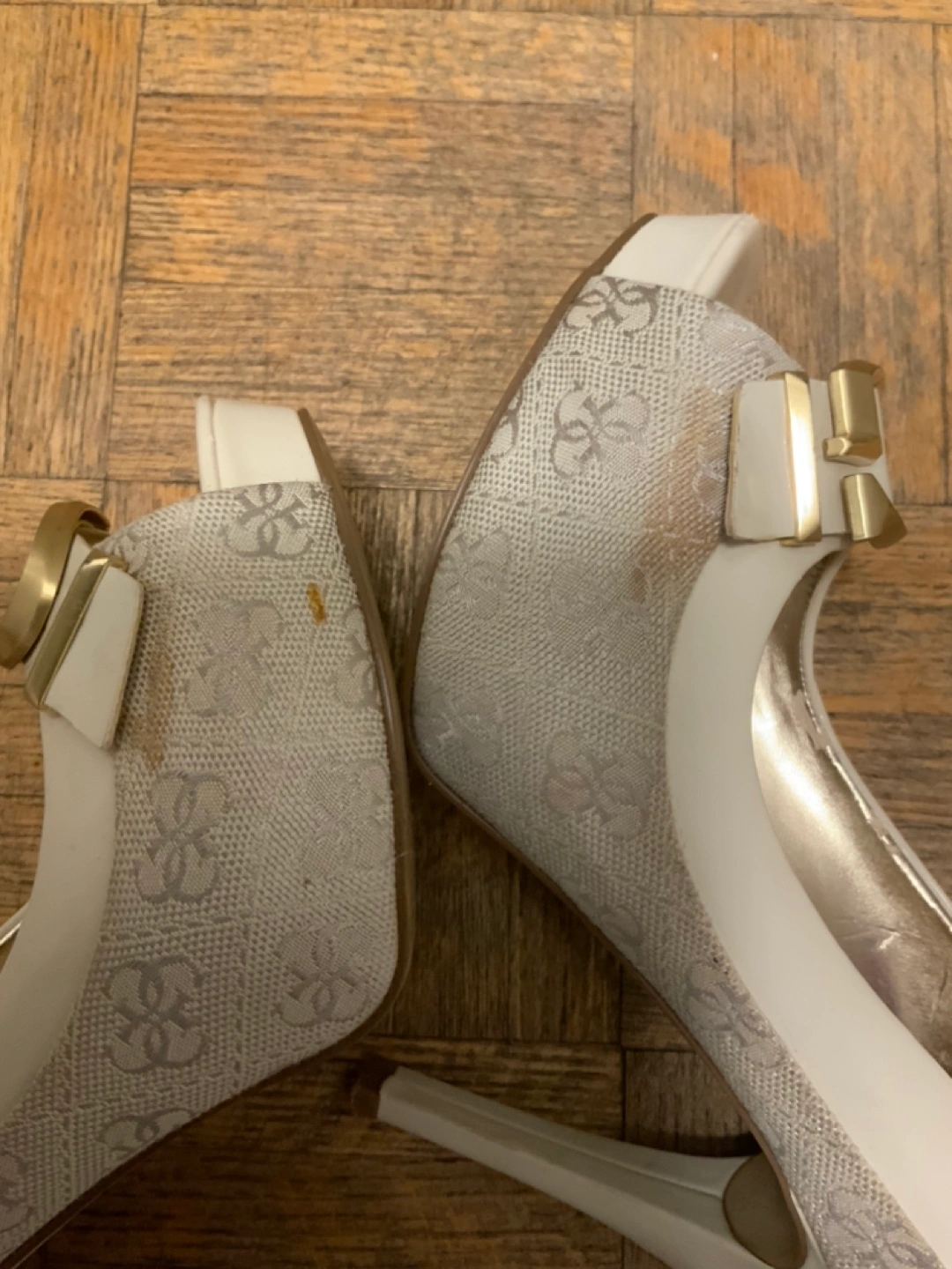 These Guess heels have a gold-tone buckle detail and a subtle pattern of the logo. Small stain on the sides, can’t tell unless you get close, as shown in the last 2 photos.