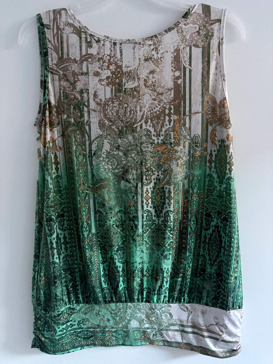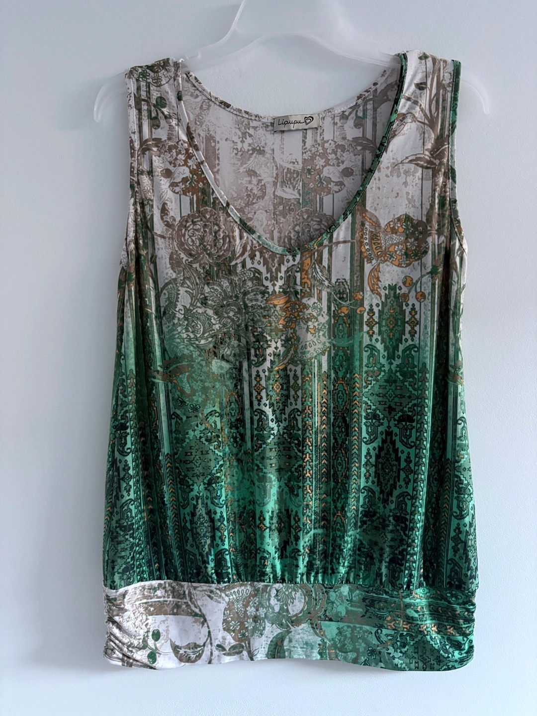 Here's a Liquipu sleeveless top in size medium! It features a beautiful green pattern. Perfect for adding a touch of style to your wardrobe. From no smoking/ no pet home