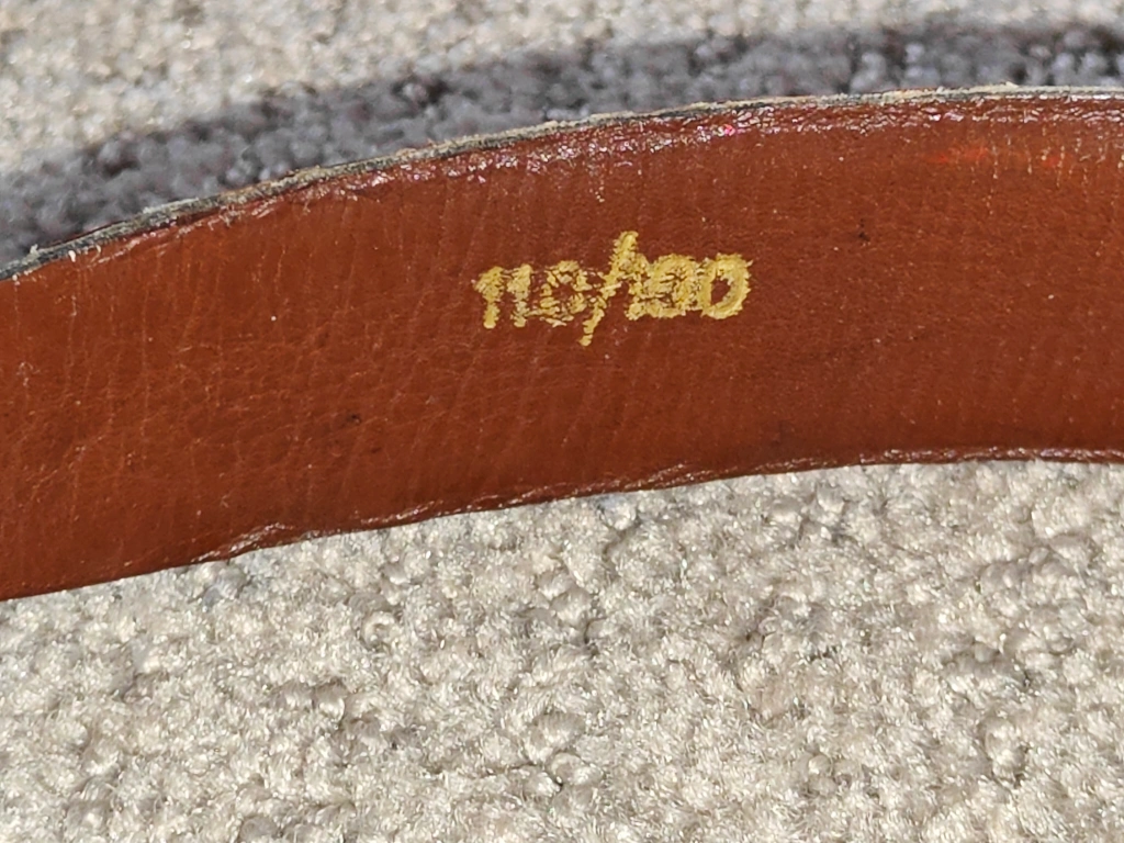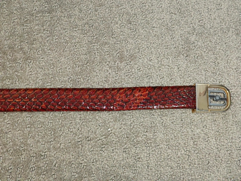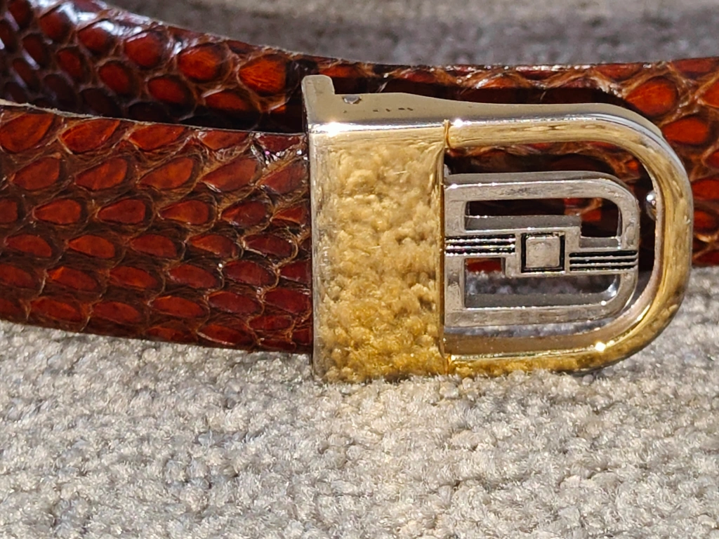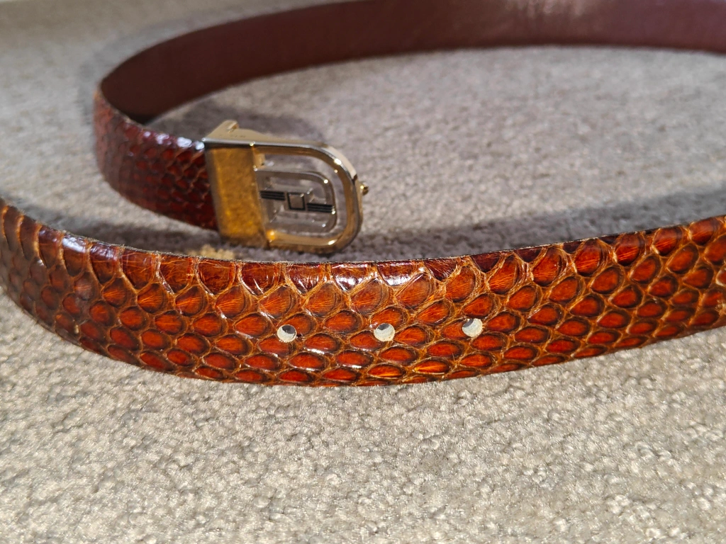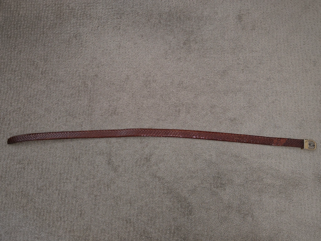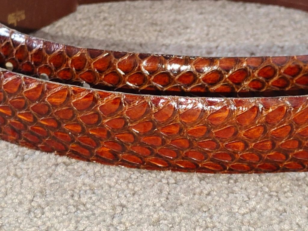 174NOTE: There are only three holes in the belt. The smallest hole is at 34" and the largest hole is at 35-1/2" (measured from the end of the buckle (closest to the strap) to the hole). Ideal for waist between 34" to 35" I am selling a Vintage Men's Animal Print Faux Snake Skin Embossed Belt in used, good condition. For sale is a stylish vintage men's belt featuring a classic animal print, faux snake-embossed pattern. This dark brown belt is in good, used condition and is the perfect accessory for adding a touch of rustic charm to your outfit. It’s an ideal choice for the Calgary Stampede, western-themed events, or as a distinctive piece for everyday casual wear. The belt is crafted with a sturdy, silver-toned buckle and a durable strap. The embossed texture gives it a high-end, classic western look. This is a versatile and stylish vintage piece that is ready for its next owner. The detailed photos show the exact condition and style of the belt. Size: 35 (fits waists between 34" to 35-1/2") or (110cm / 100cm) Strap Length: 41-1/2" Total Length: 42-1/2" Belt Width: 1" Colour: Dark Brown Comes from a pet and smoke-free environment. Pickup in Mount Pleasant (NW Calgary)