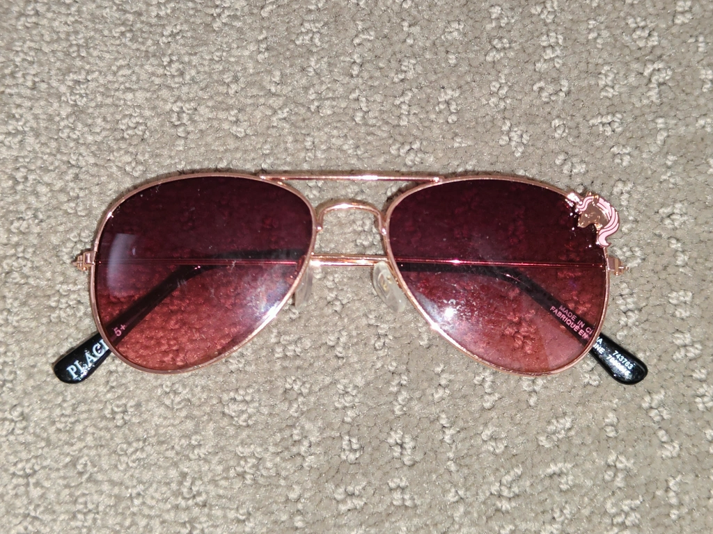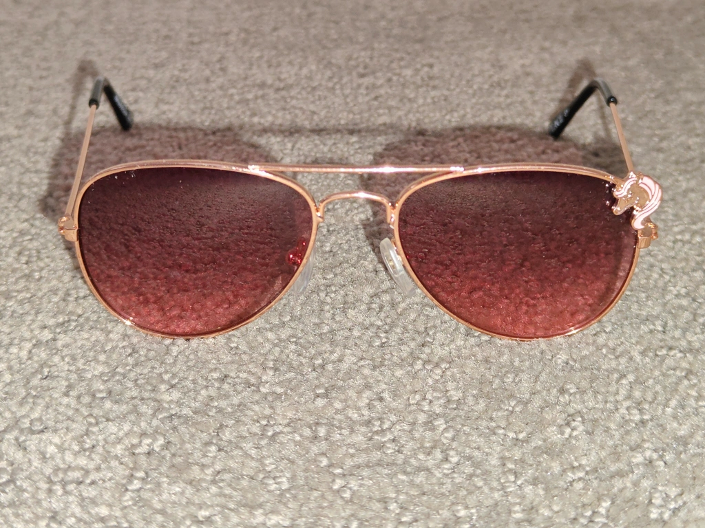 I am selling a Child Girls Unicorn Icon Aviator Sunglasses in Rose Gold colour in used, good condition. Minor signs of scratches on the lens and part of the frame but overall in good condition.
