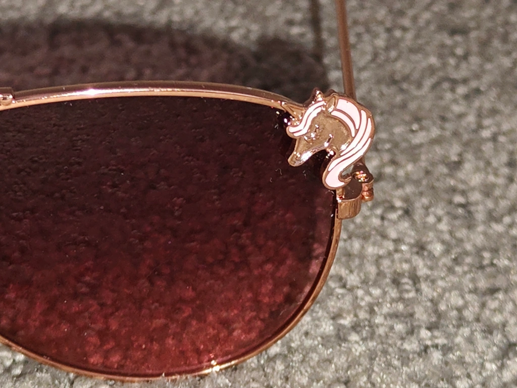 I am selling a Child Girls Unicorn Icon Aviator Sunglasses in Rose Gold colour in used, good condition. Minor signs of scratches on the lens and part of the frame but overall in good condition.