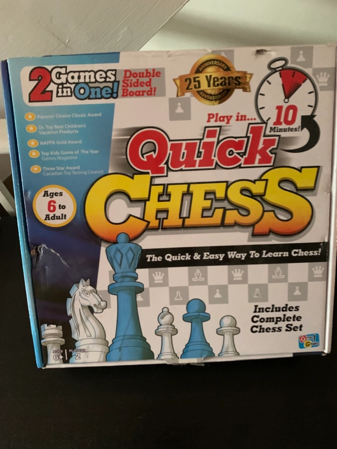 Selling a Quick Chess game. It's a 2-in-1 game with a double-sided board. It's designed to be quick and easy to learn, with games that play in about 10 minutes. Suitable for ages 6 to adult, and includes a complete chess set