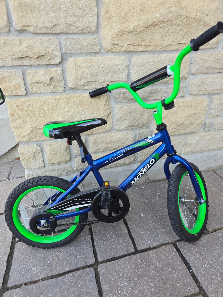 Selling a Movelo Rush kids' bike in blue and green! It's in great shape and ready for a new rider. Perfect for learning to ride and having fun outdoors. comes with Training wheels on both sides . perfect shape . looks like new .