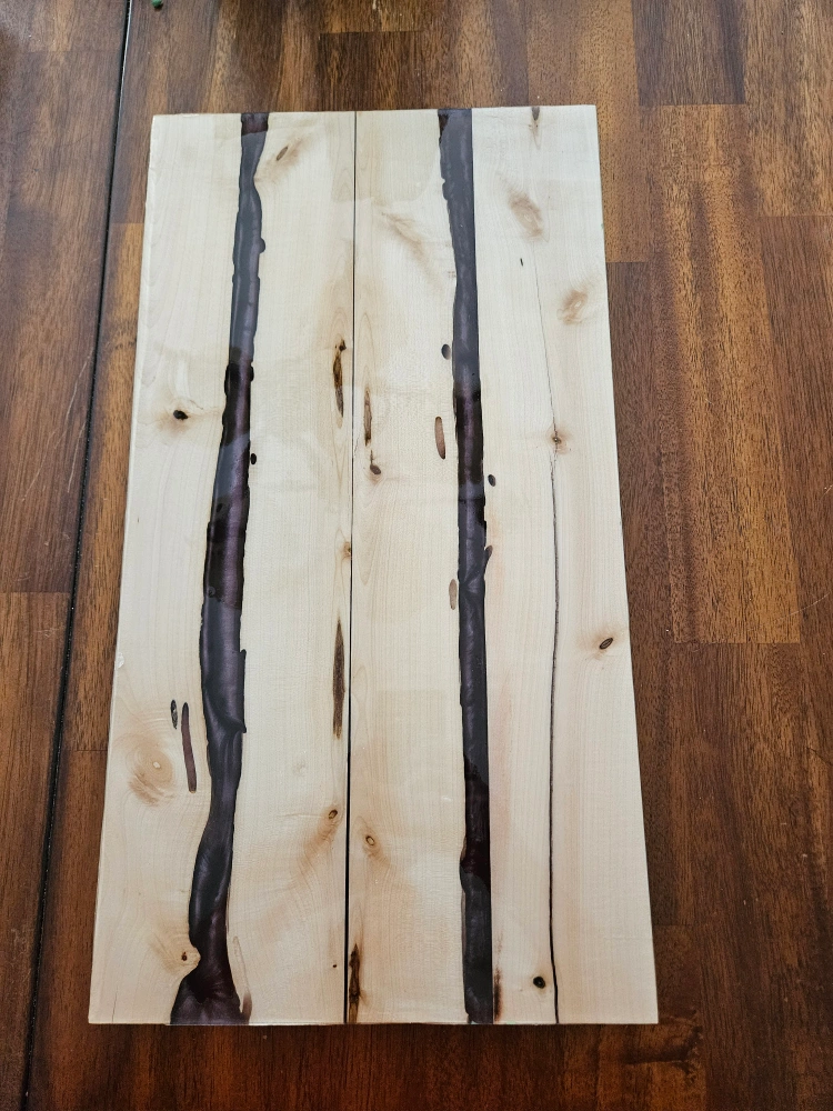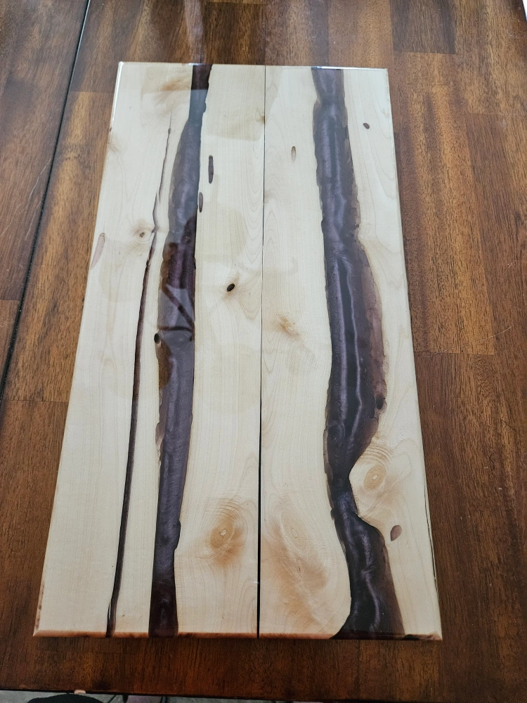 60I'm selling a wood board with resin accents. It's a unique piece that would be a great addition to any home. The wood has a light, natural finish, and the resin is a dark, contrasting colour. It could be used as a serving board or a decorative piece
