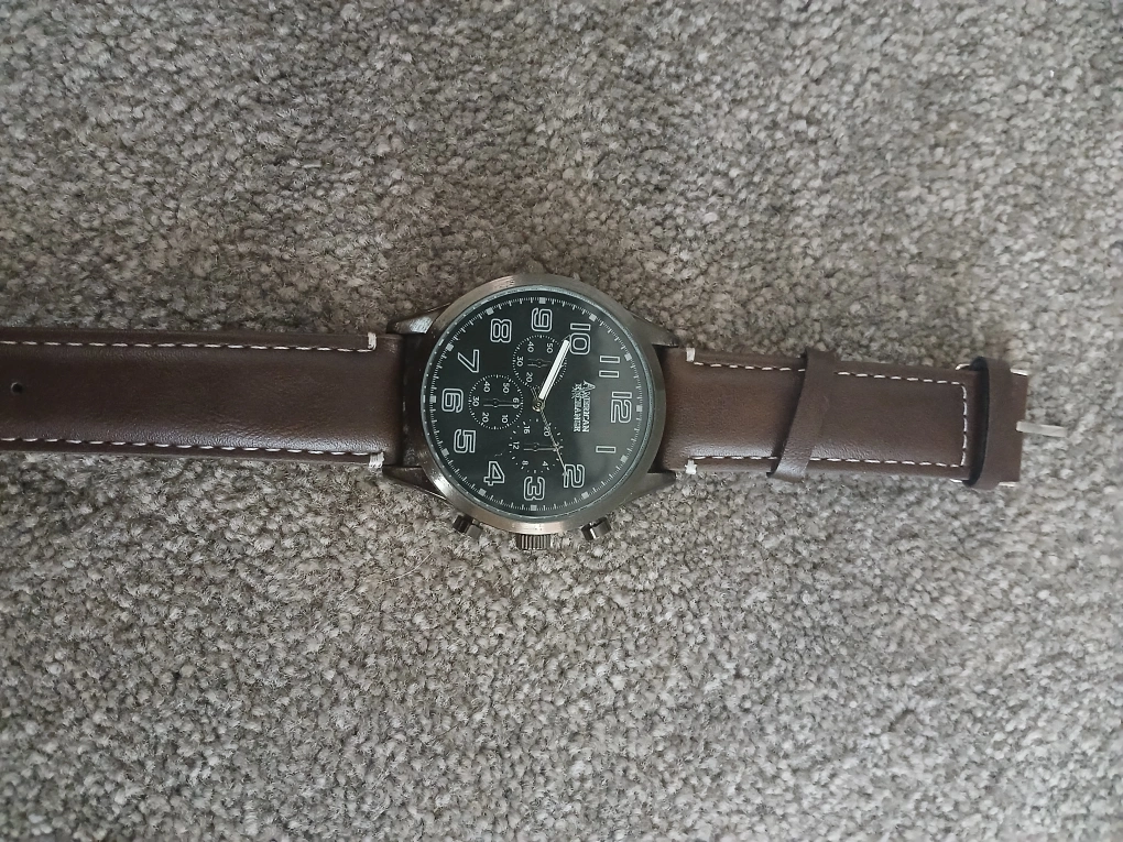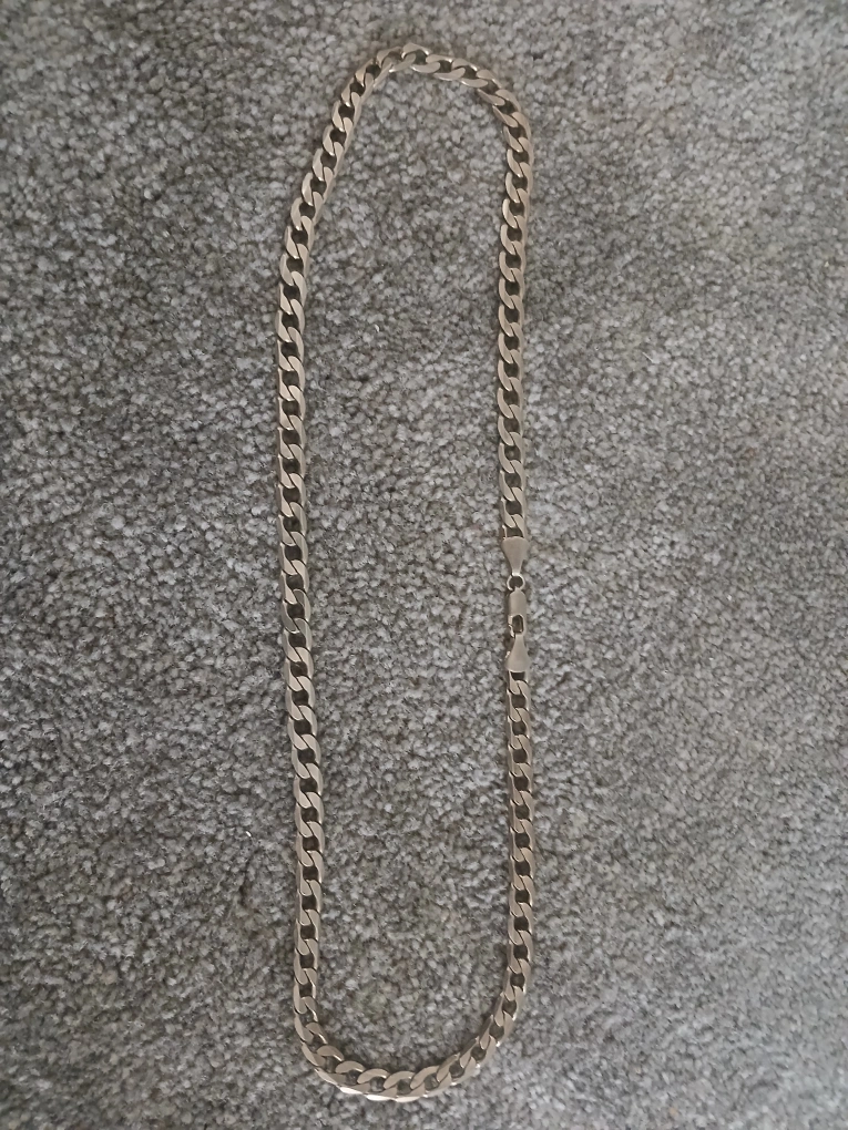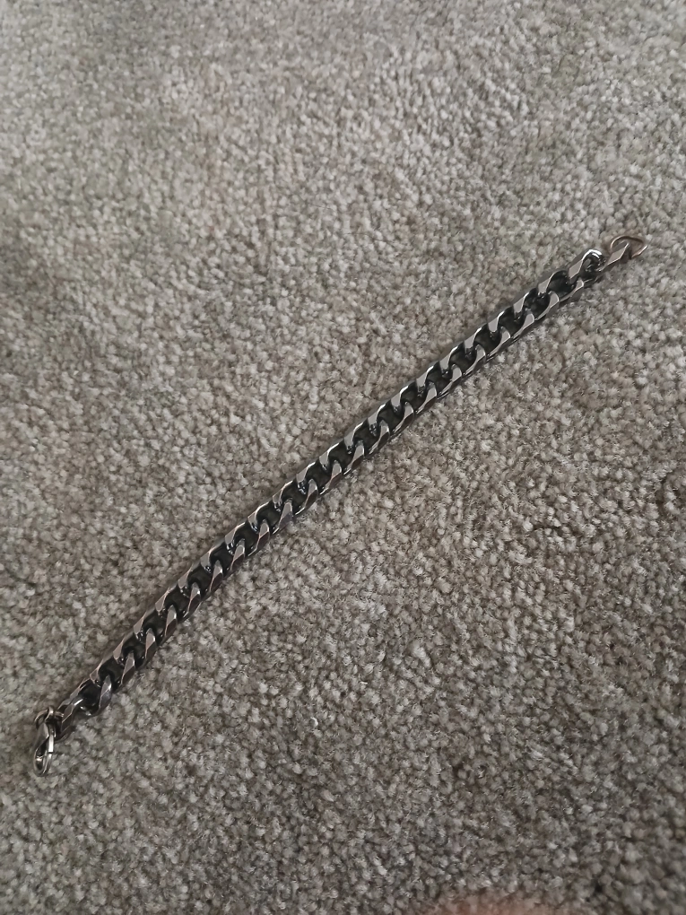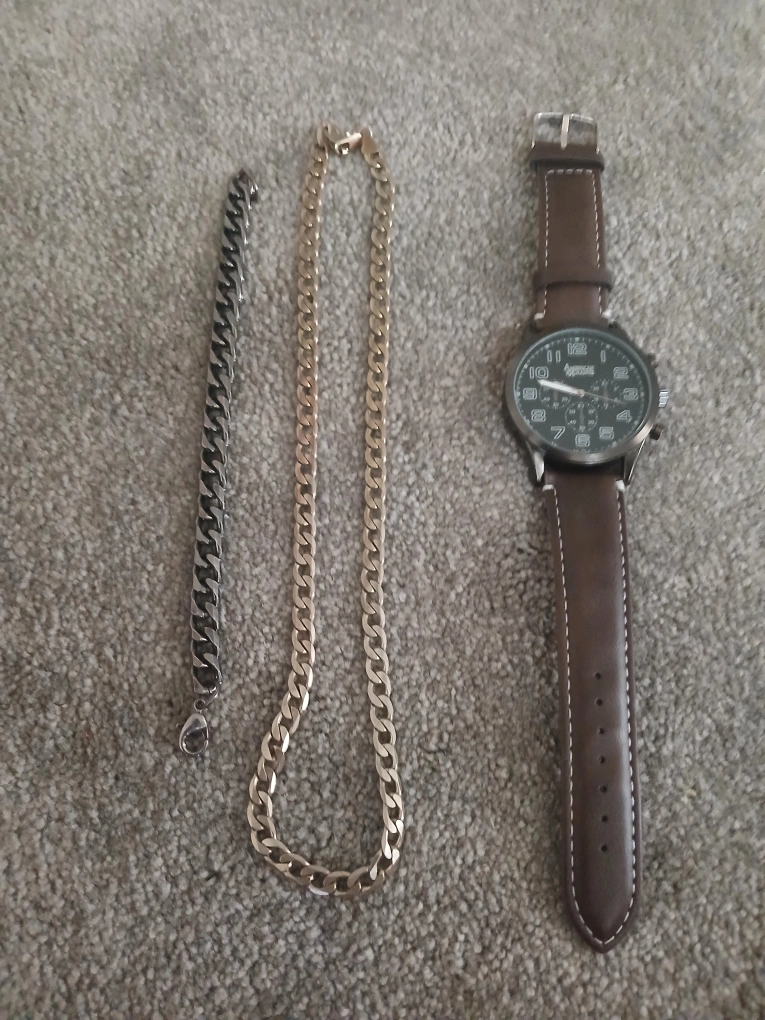 Selling a silver curb chain necklace, a leather watch, and bracelet set. They are in good condition and ready for a new home