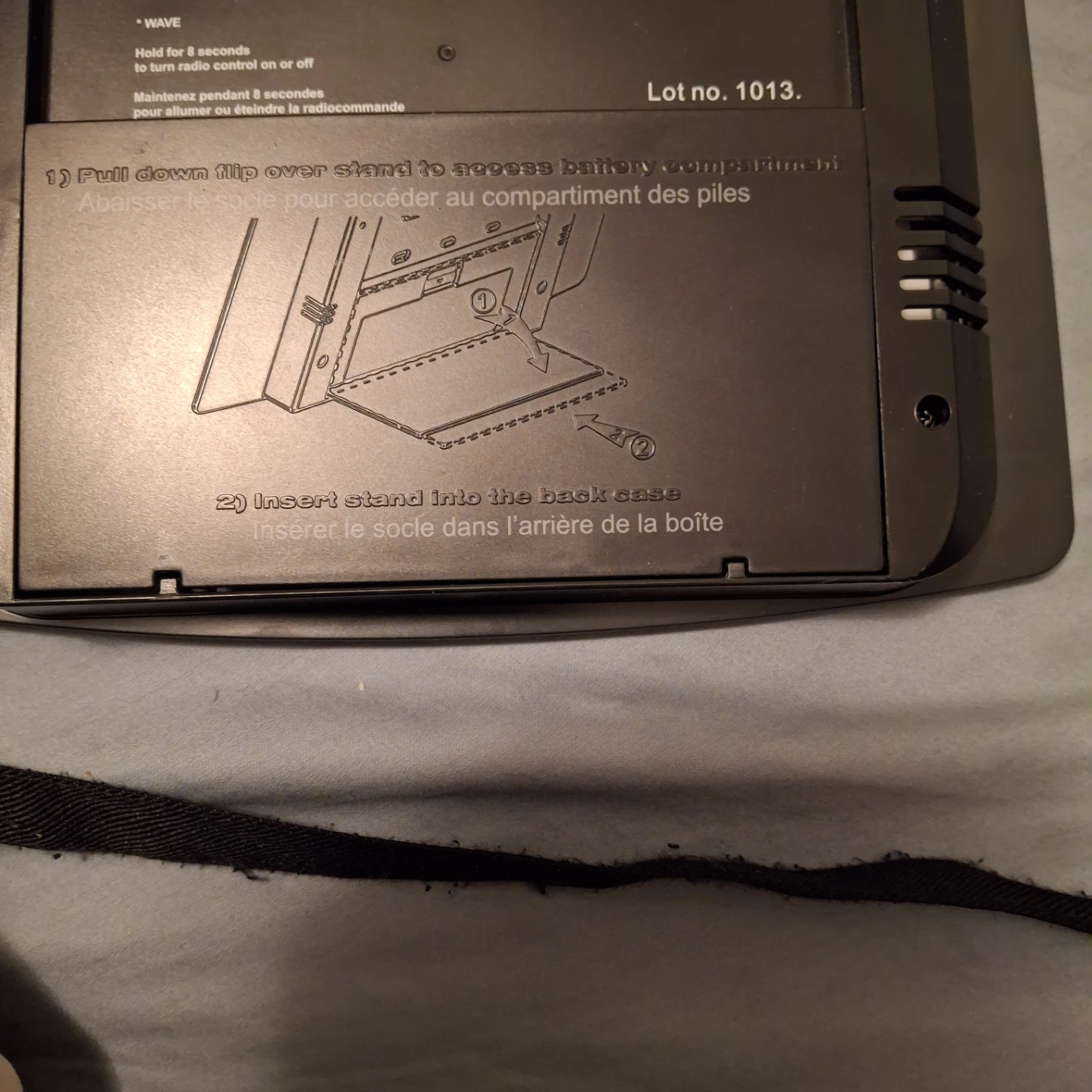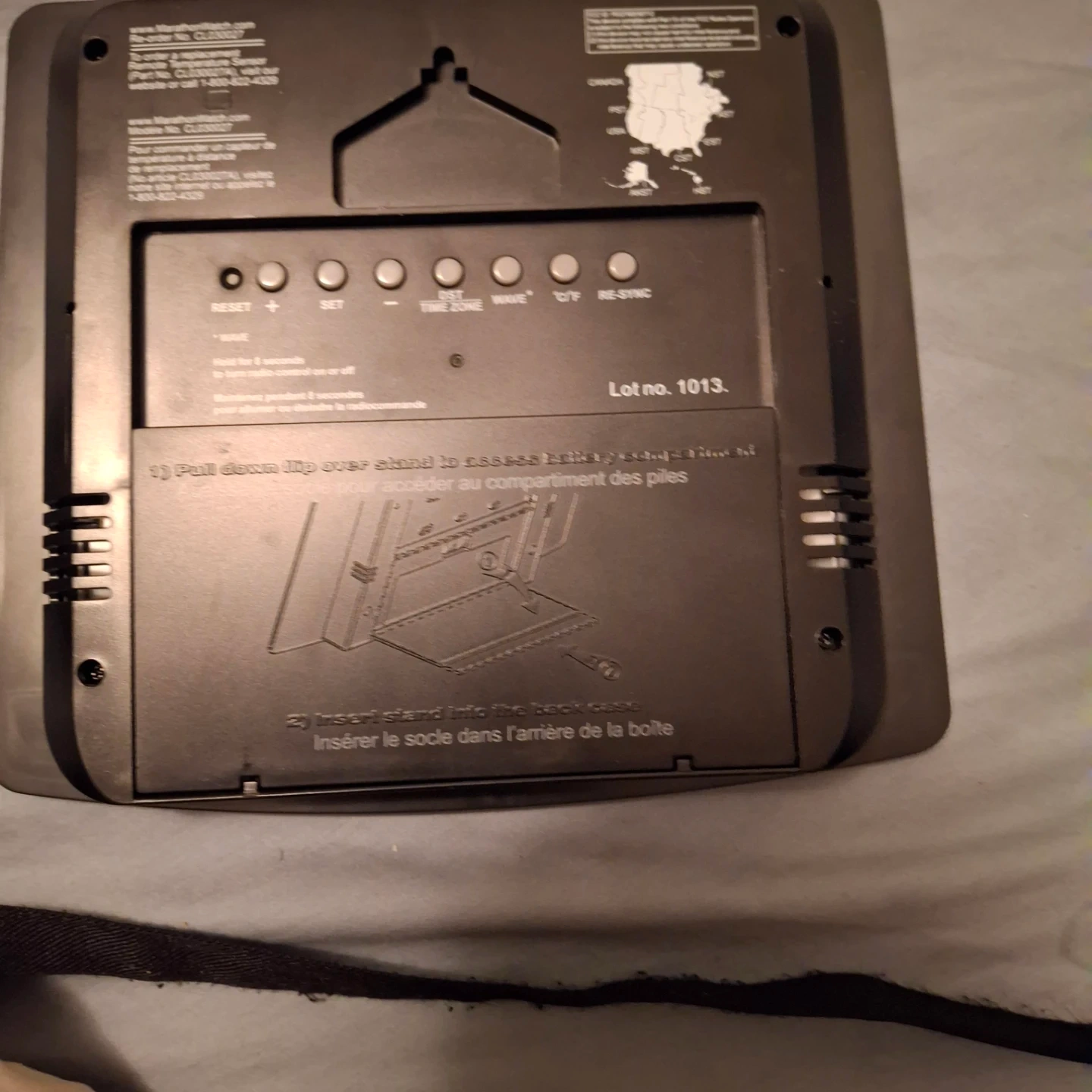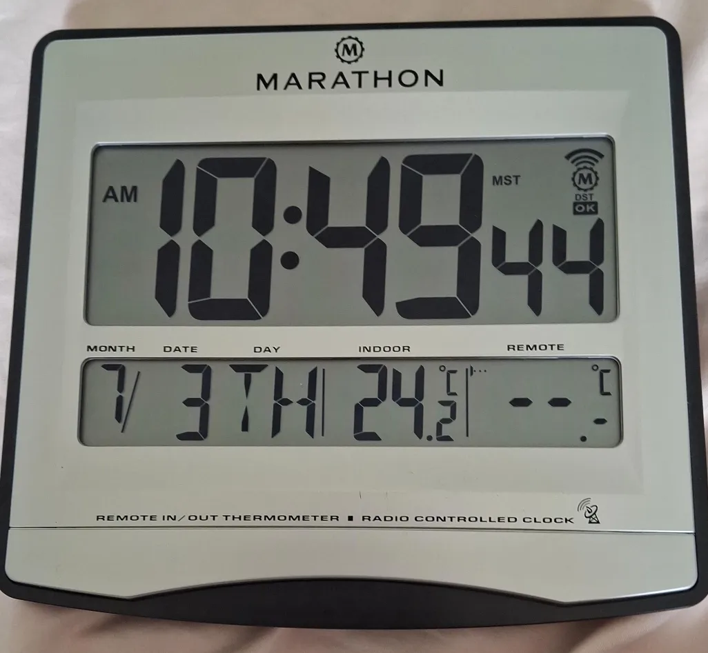 Marathon digital wall clock. It also displays the indoor and remote temperature. The display shows the month, date, day, and time in AM/PM format.