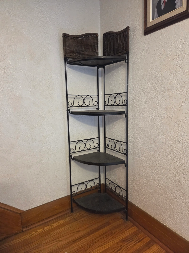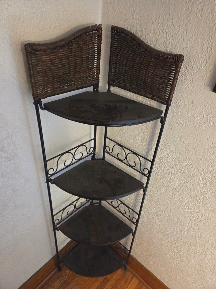 This corner shelf is perfect for adding some storage and style to any room! It features a wicker top and a sturdy metal frame and wooden shelves giving it a unique and charming look