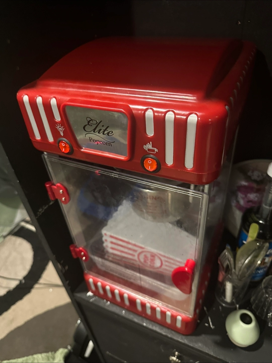 Selling a red Elite popcorn machine. It's in good condition and ready to make some delicious popcorn! You can test it before purchasing there is no issue with it light and heat work perfectly bought it last month for a even but we don’t use it