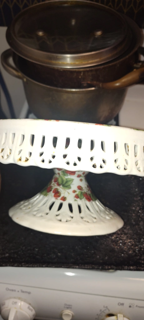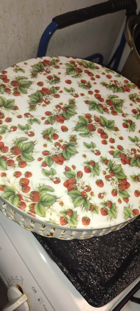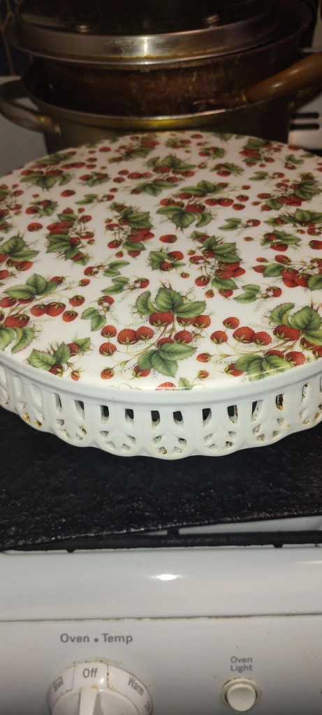 Selling a cute cake stand with a strawberry pattern! It has a decorative, lattice-style edge. Perfect for displaying your baked goods or desserts