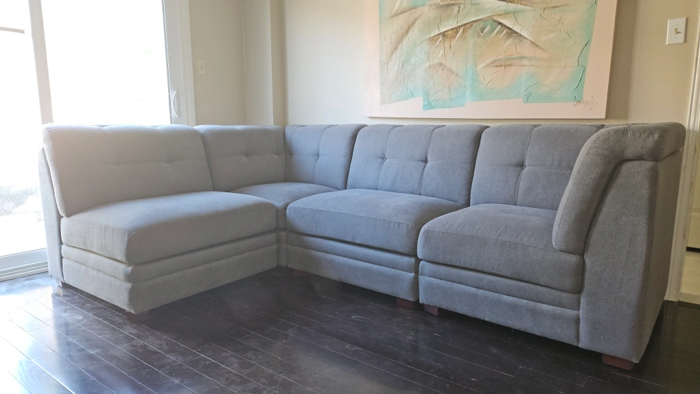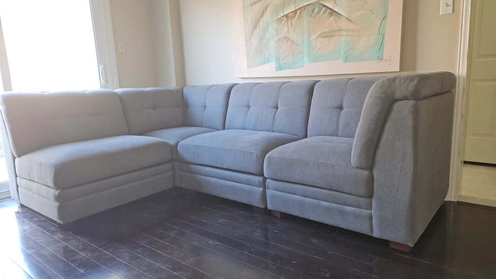 Selling a comfortable grey sectional sofa! It's in great shape and would be perfect for a living room or entertainment area. It has a modern, clean look that will fit in with any decor. If you're looking for a cozy place to relax, this sectional is a great choice