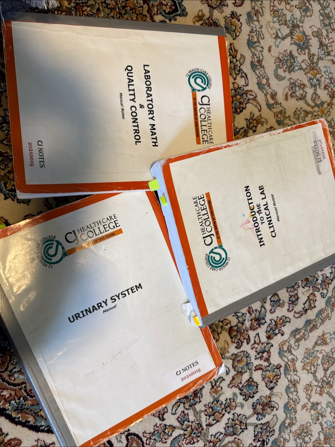 Selling three Healthcare College manuals: Laboratory Math & Quality Control, Urinary System, and Introduction to the Clinical Lab
