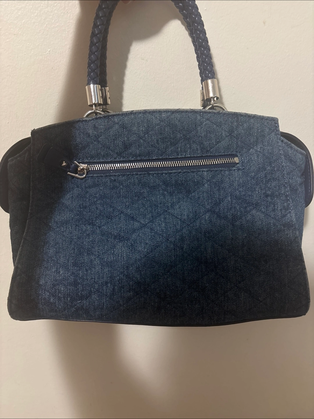 Here's a lovely Guess handbag in a denim material with beautiful floral embroidery! It features a unique braided handle and a cute padlock charm. Perfect for adding a touch of style to any outfit!