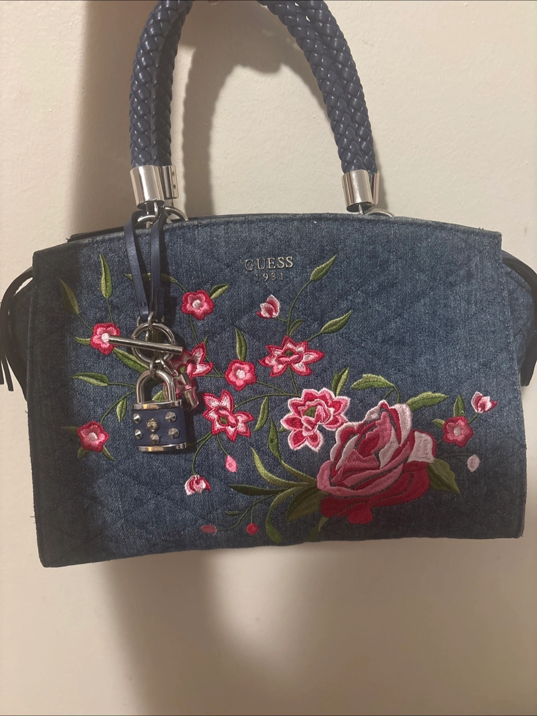 Here's a lovely Guess handbag in a denim material with beautiful floral embroidery! It features a unique braided handle and a cute padlock charm. Perfect for adding a touch of style to any outfit!