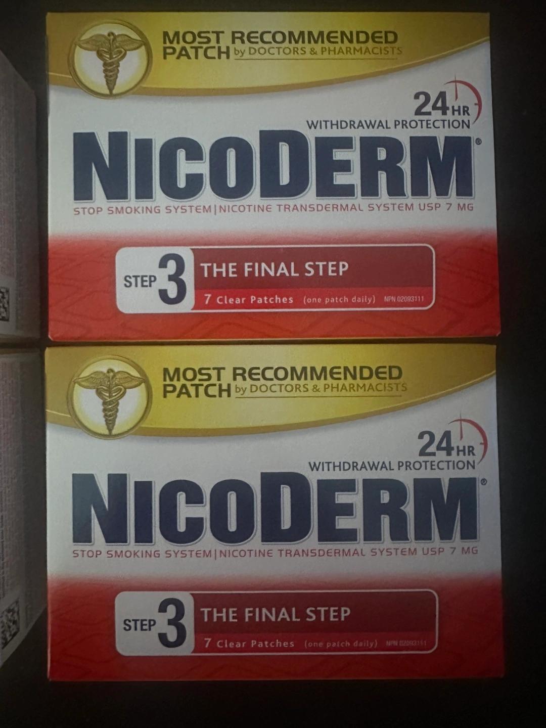 Selling Nicoderm patches, Step 2 and Step 3, along with Nicorette gum. The gum is ultra fresh mint flavour. The patches are 24-hour withdrawal protection and are the most recommended patch by doctors and pharmacists. The expiration date for the gum is July 2027.
