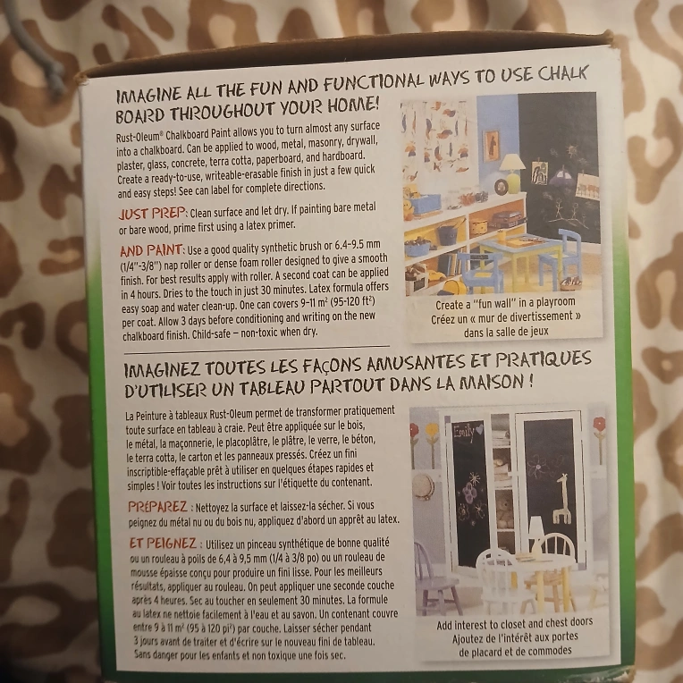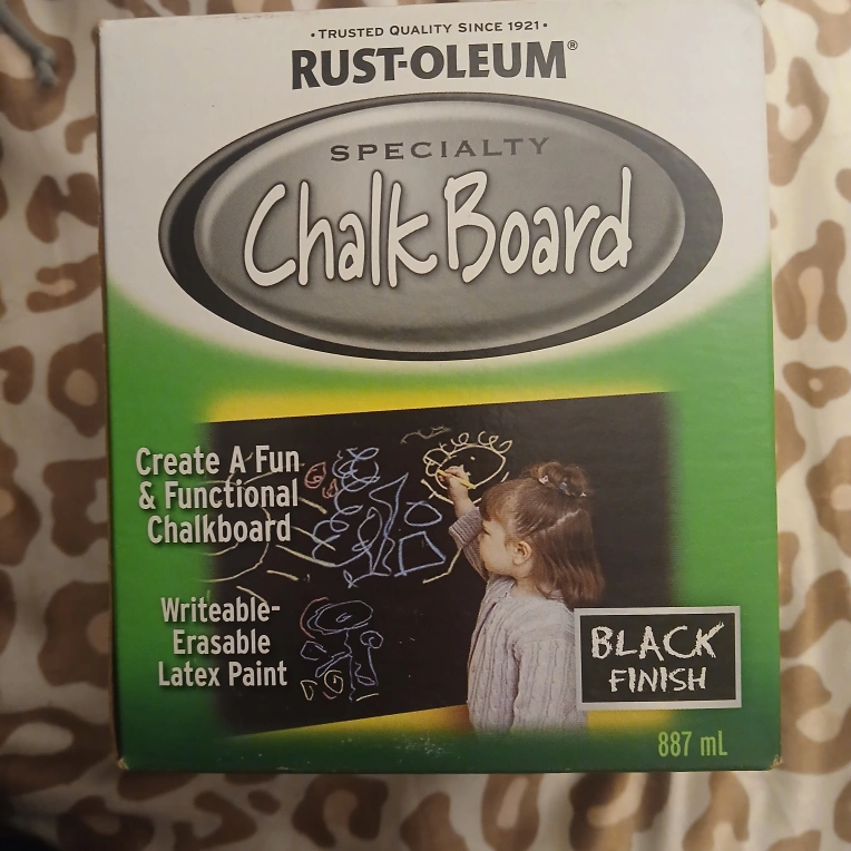 Selling a can of Rust-Oleum Specialty Chalk Board paint with a black finish. It's perfect for creating a fun and functional chalkboard surface on wood, metal, masonry, drywall, plaster, concrete, terra cotta, paperboard, and hardboard. The latex paint is writeable and erasable, making it great for various projects around the home