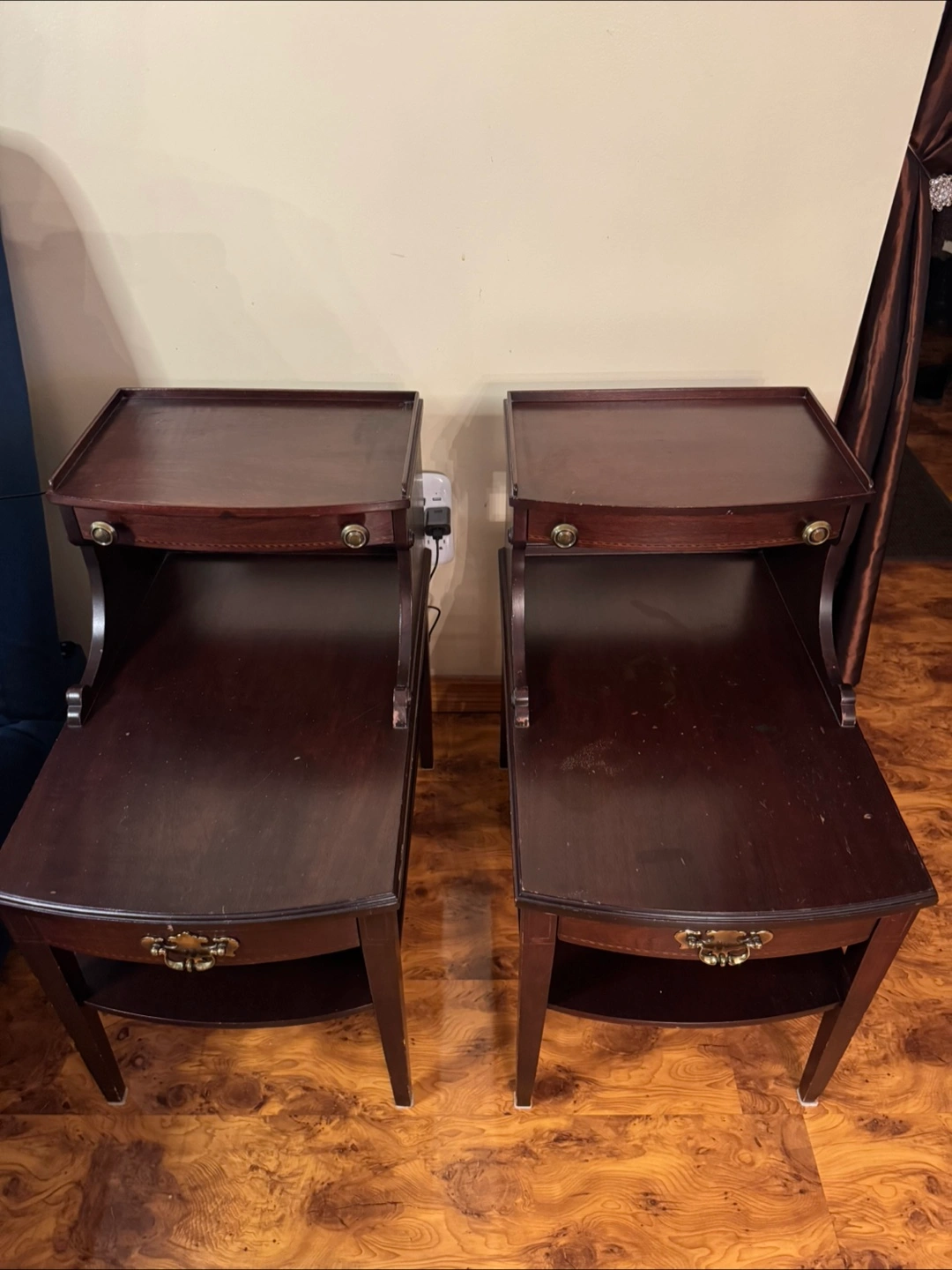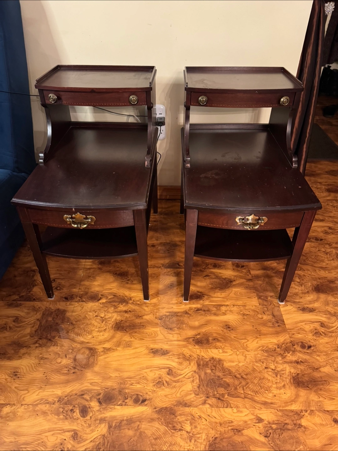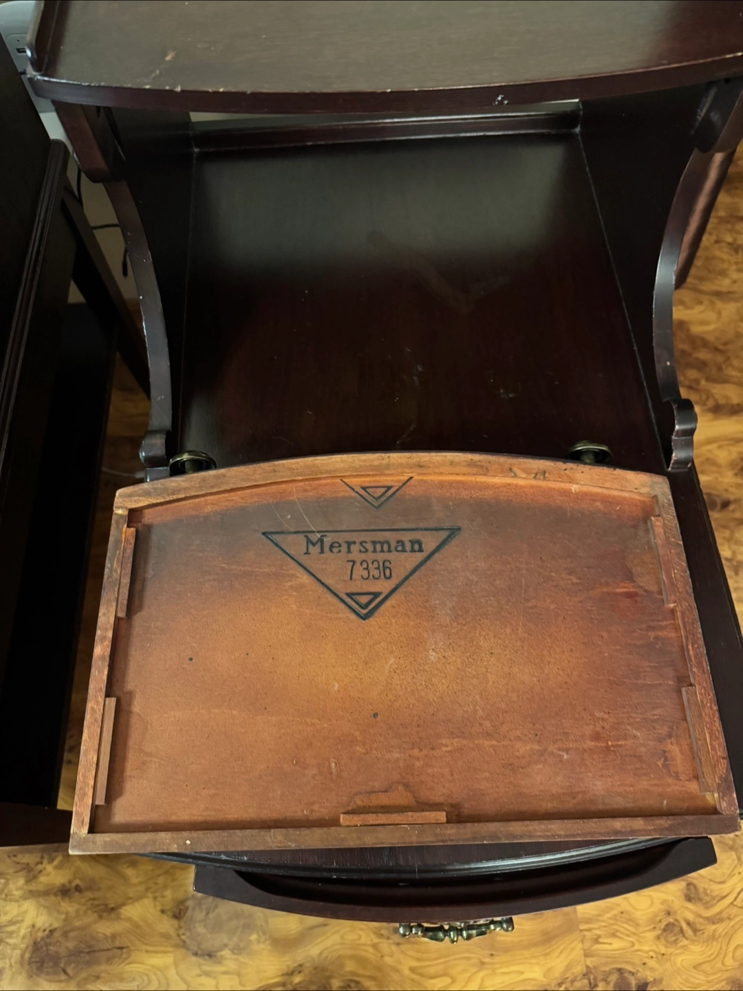 60Selling a pair of Mersman end tables, model 7336. They're a lovely dark wood colour and have a drawer for storage. A great addition to any living room or bedroom! High 27.5 inches,Wide15.5 inches