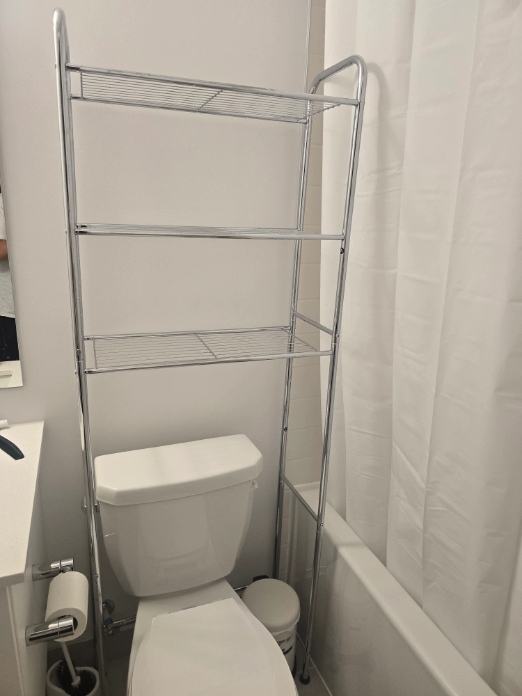 Selling a chrome over-the-toilet storage shelf! It's in great shape and perfect for adding some extra storage space to your bathroom. It fits neatly over the toilet, making it a handy spot for storing toiletries or towels