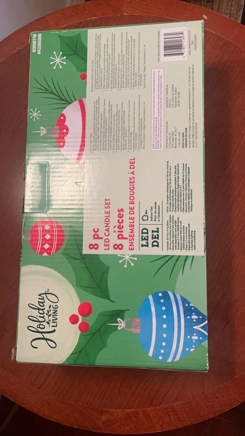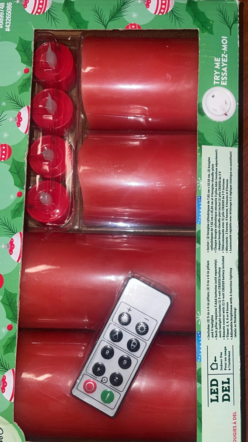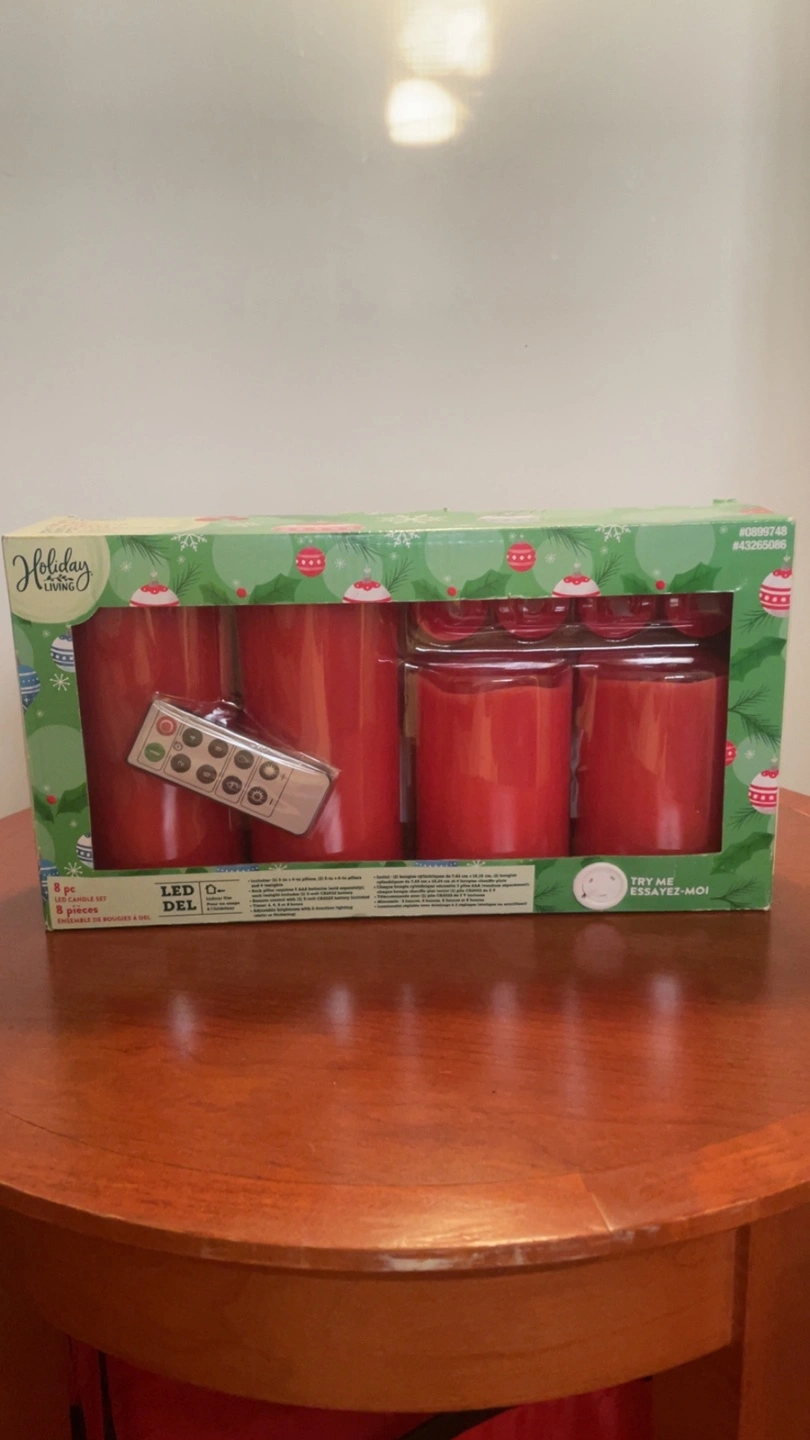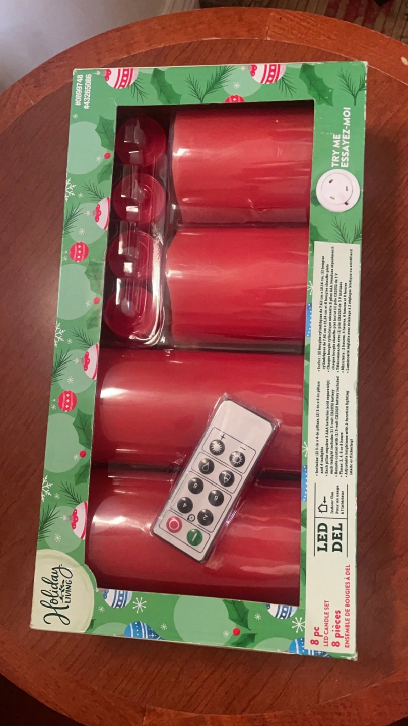 New in box. Eight-piece LED candle set. Includes three large candles, four small candles, and one remote. Red candles. Remote control for easy operation.