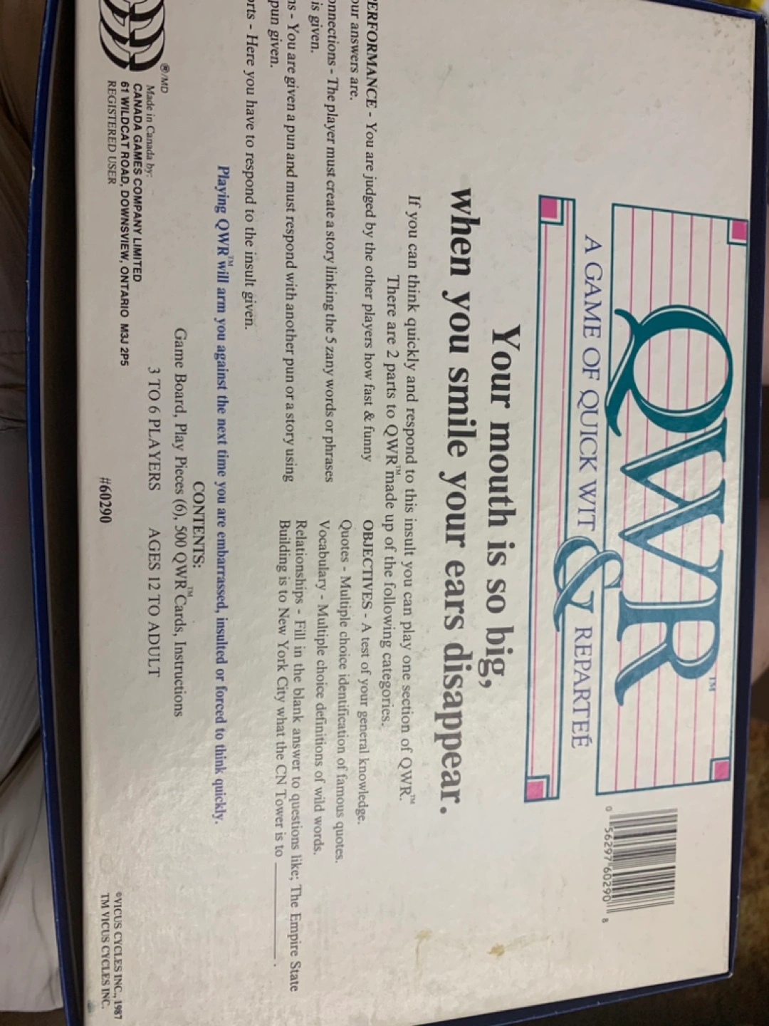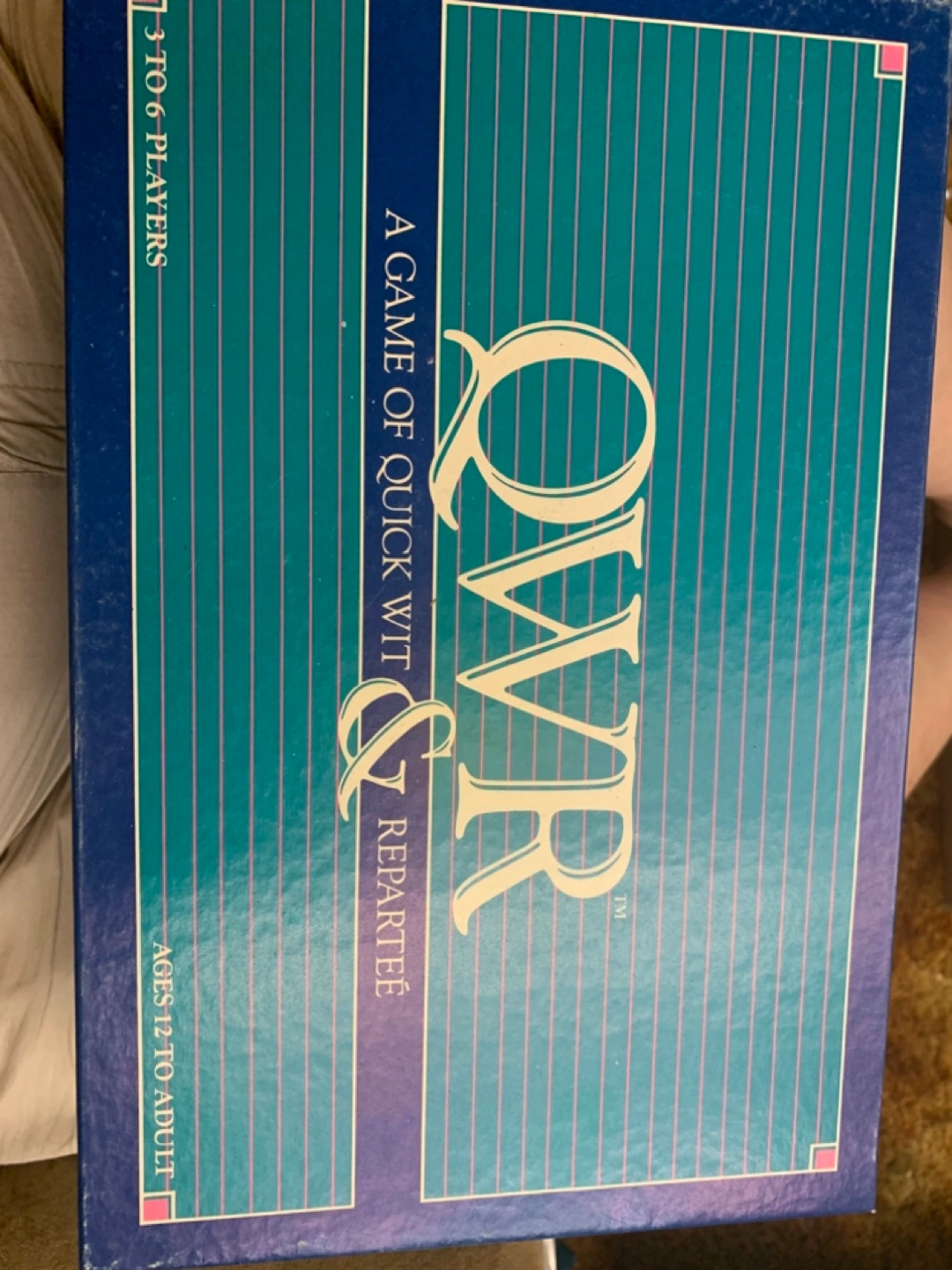 Selling a vintage copy of QWR, a game of quick wit and repartee! This game is for 3 to 6 players and is suitable for ages 12 to adult. It includes a game board, play pieces, 500 QWR cards, and instructions. Get ready to arm yourself against the next insult or forced to think quickly!