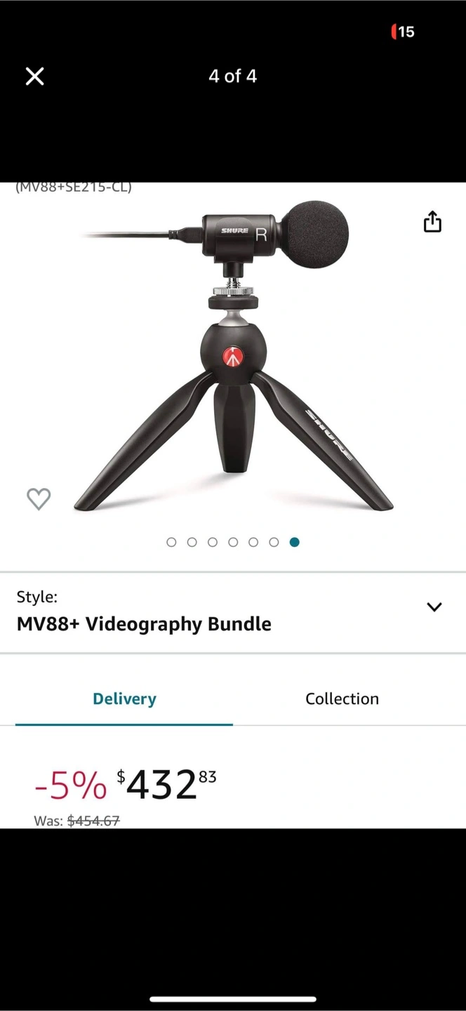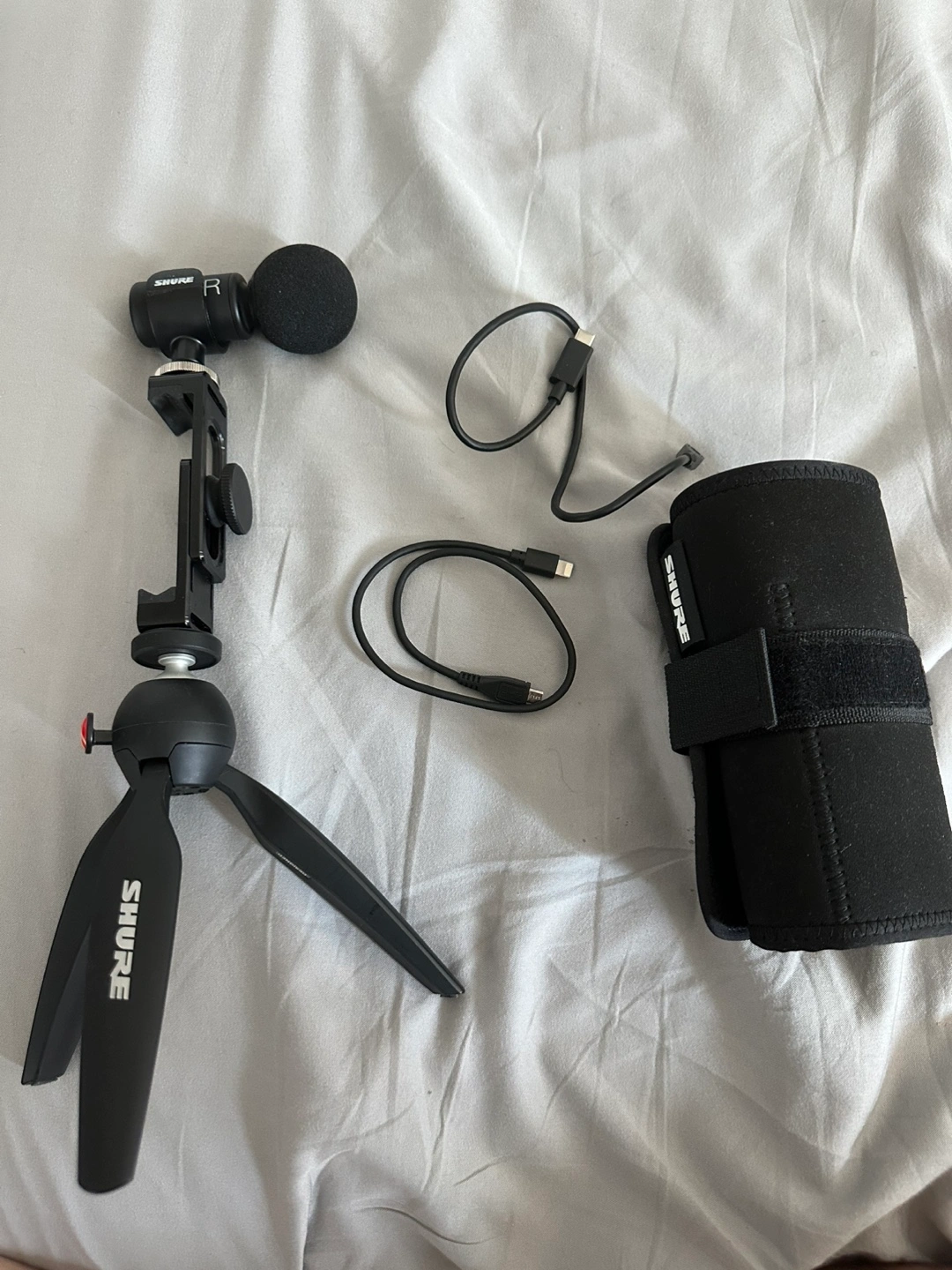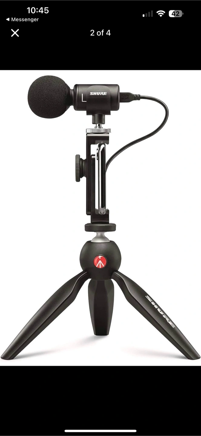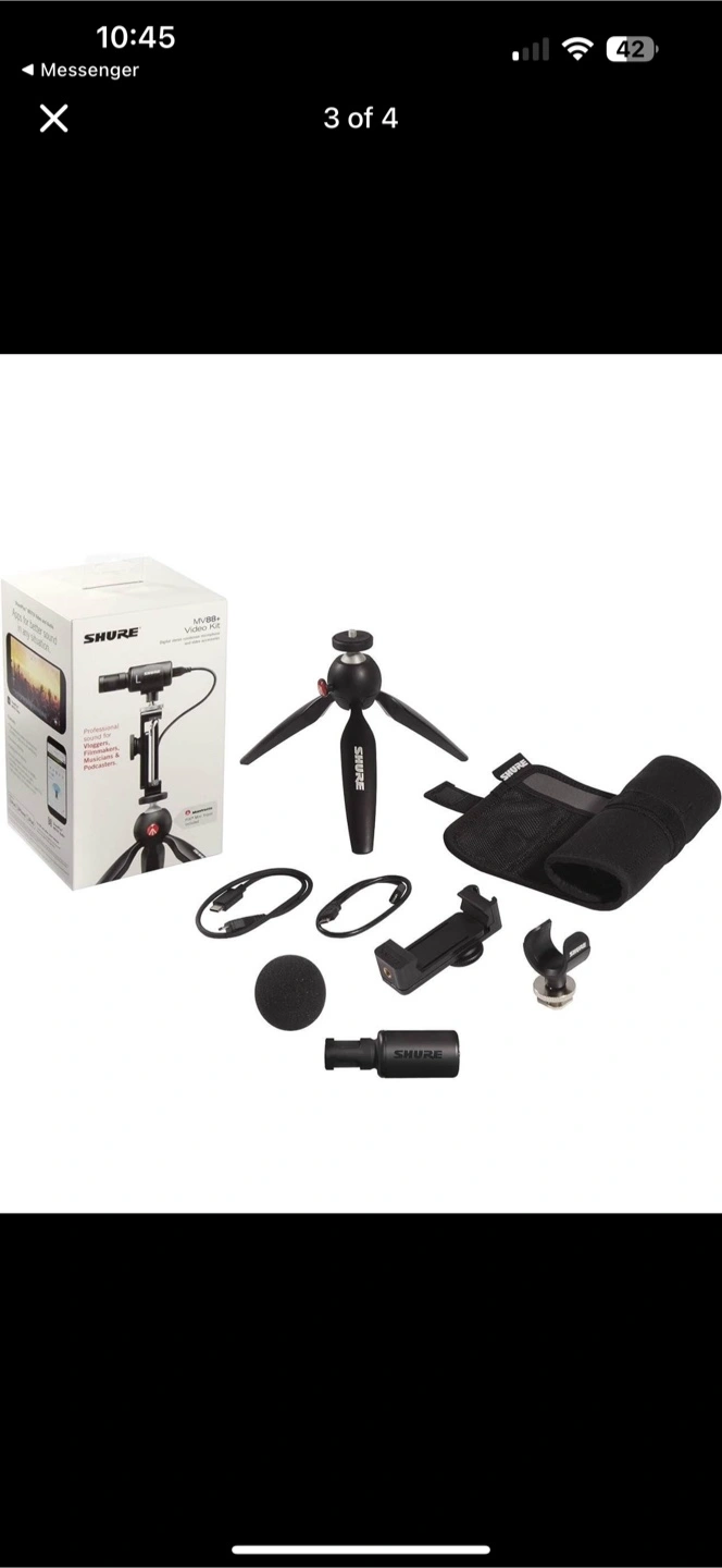 Selling a lightly used Shure MV88+ Video Kit. This kit includes the microphone, Manfrotto PIXI mini tripod, phone clamp, and all necessary cables. It's a great portable setup for recording high-quality audio and video on the go!