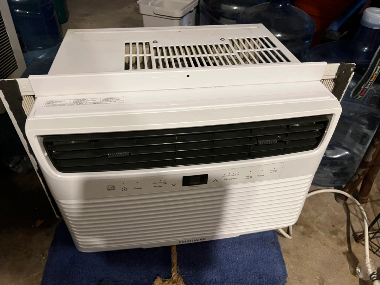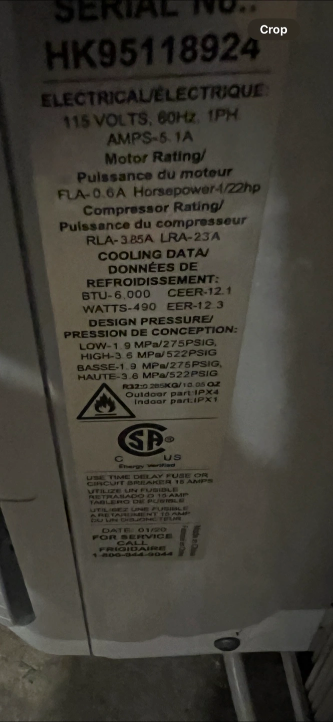 Good for a small room , Frigidaire window air conditioner with 6,000 BTU. The label shows it operates at 115 Volts and 60Hz, drawing 5.1 Amps. It has a cooling capacity of 6,000 BTU