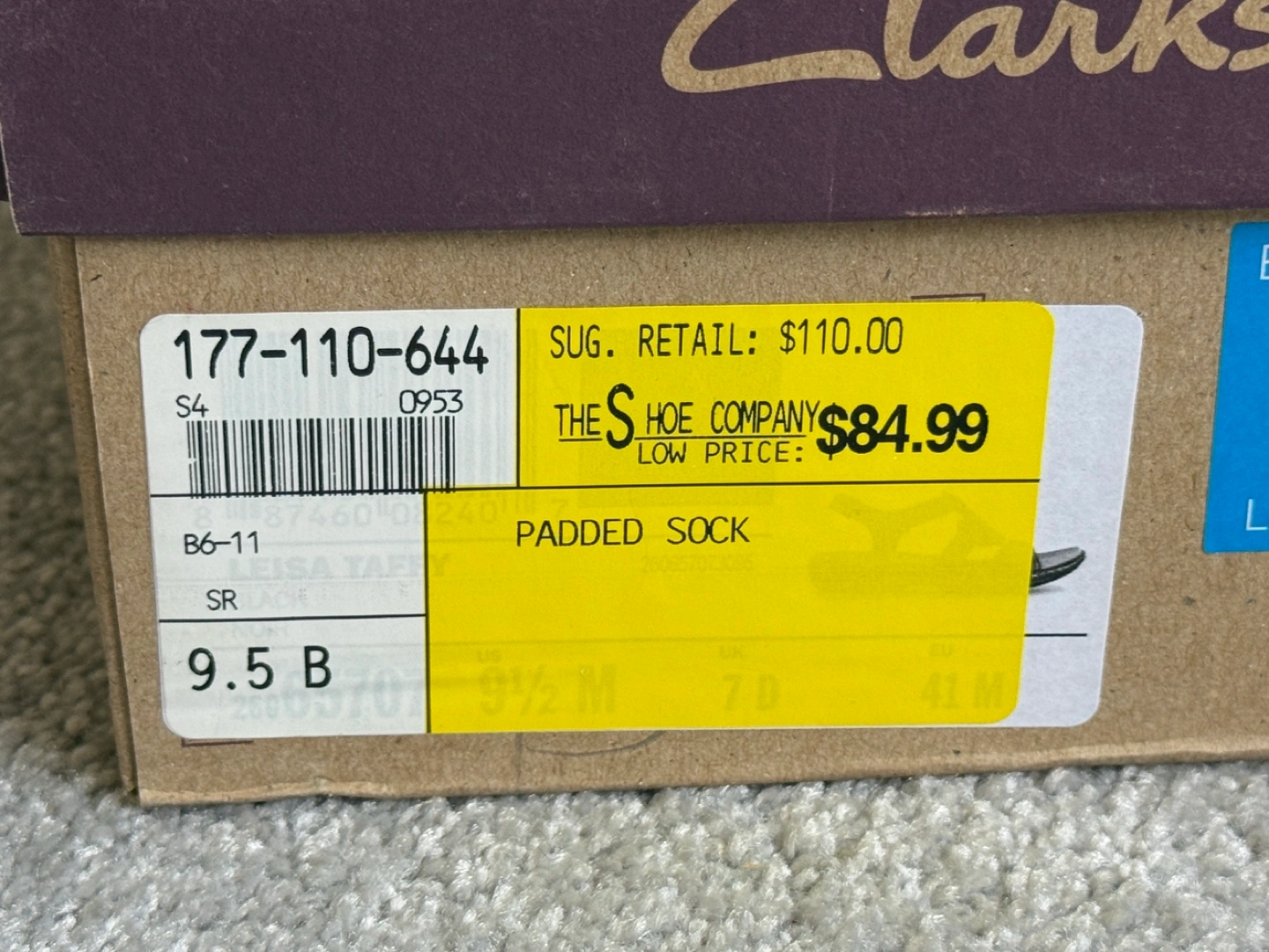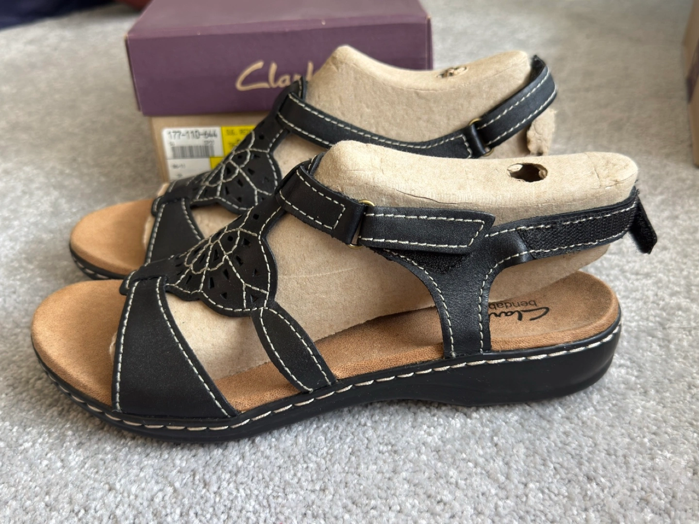 Selling a pair of Clarks Leisa Taffy sandals in black, size 9.5. These sandals feature a padded sock for extra comfort. They retail for $110.00, but were on sale for $84.99. The original box is included! Clarks Women's, Leisa Taffy Low Heel Comfortable Sandals.