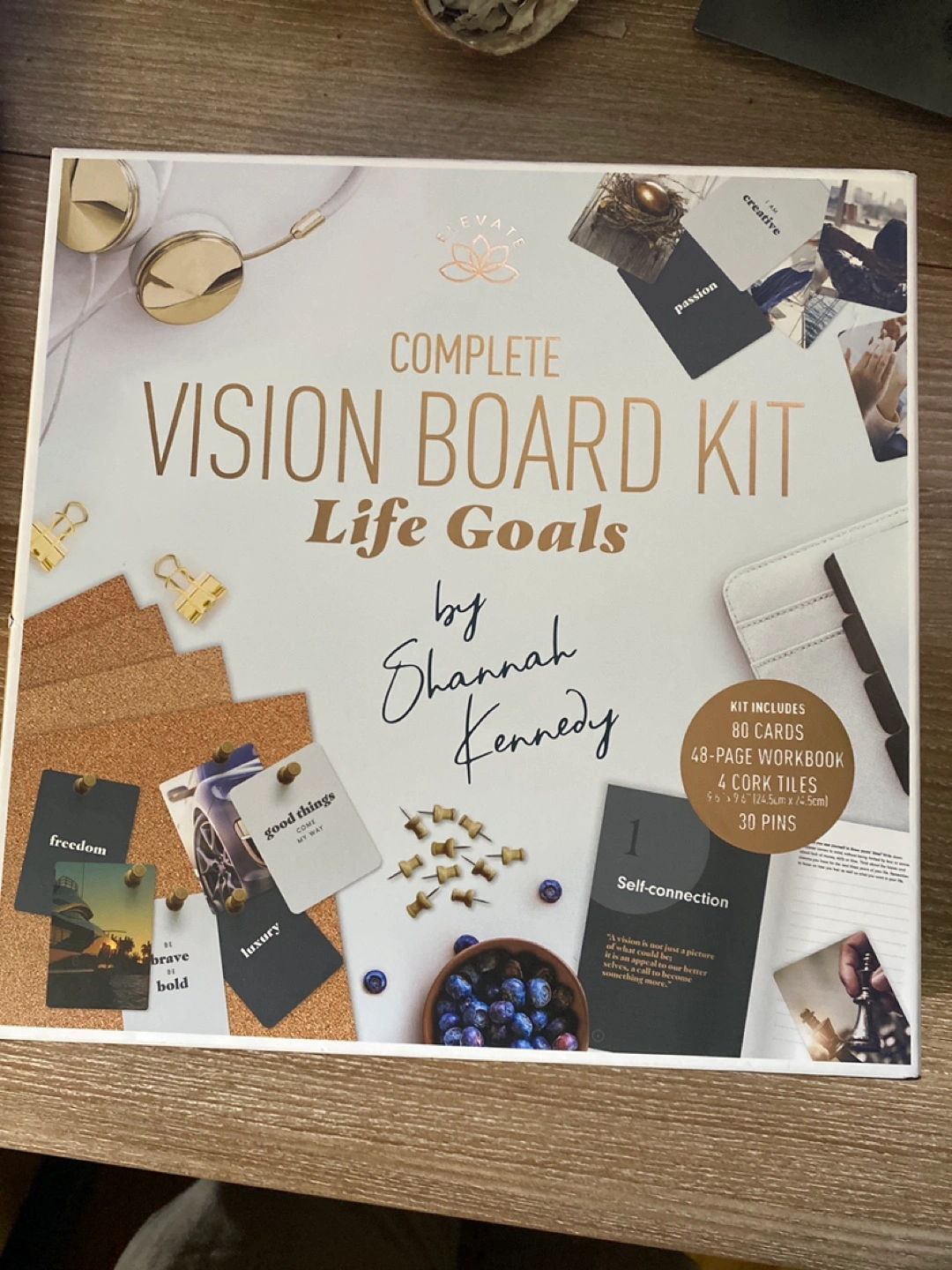 Get ready to manifest your dreams with this Elevate Complete Vision Board Kit! This kit includes 80 prompt cards with words and images, a 48-page workbook, 4 cork tiles (9.6" x 9.6" each), and 30 pins. It's a fun and creative way to bring your life goals into action