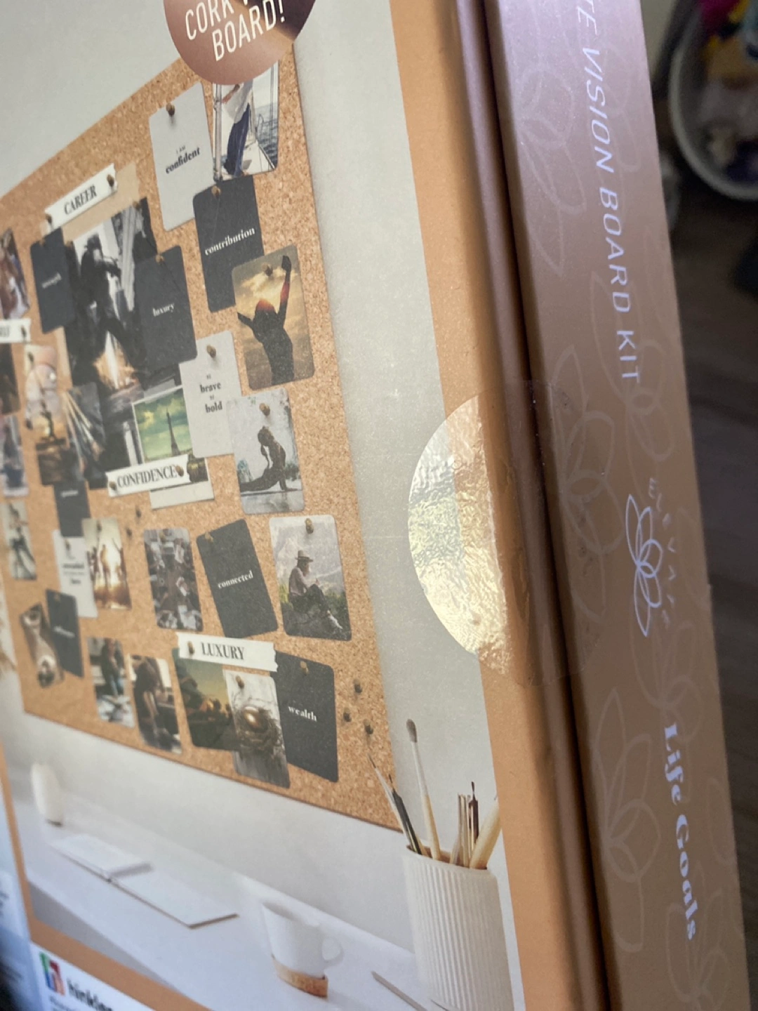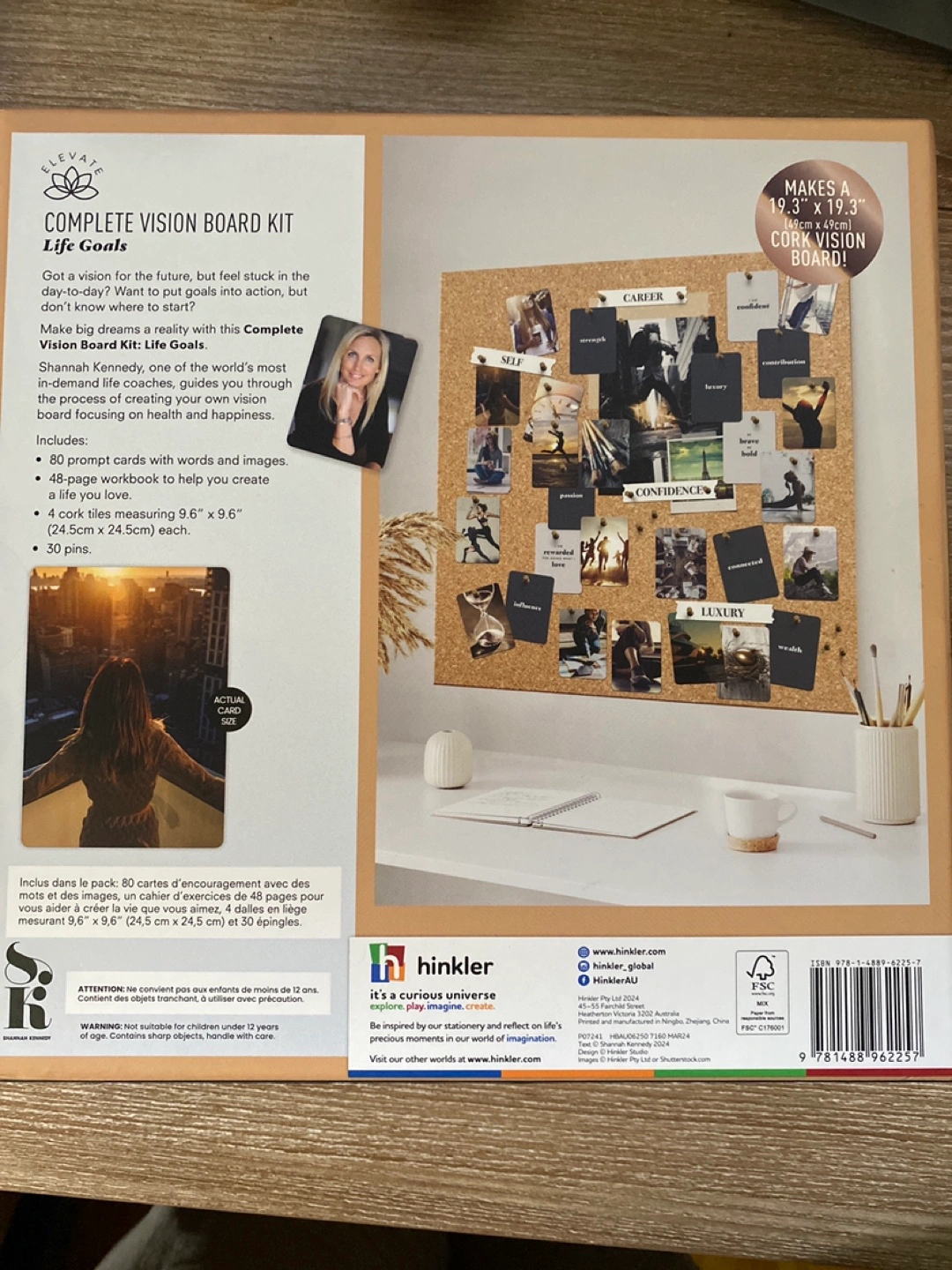 Get ready to manifest your dreams with this Elevate Complete Vision Board Kit! This kit includes 80 prompt cards with words and images, a 48-page workbook, 4 cork tiles (9.6" x 9.6" each), and 30 pins. It's a fun and creative way to bring your life goals into action