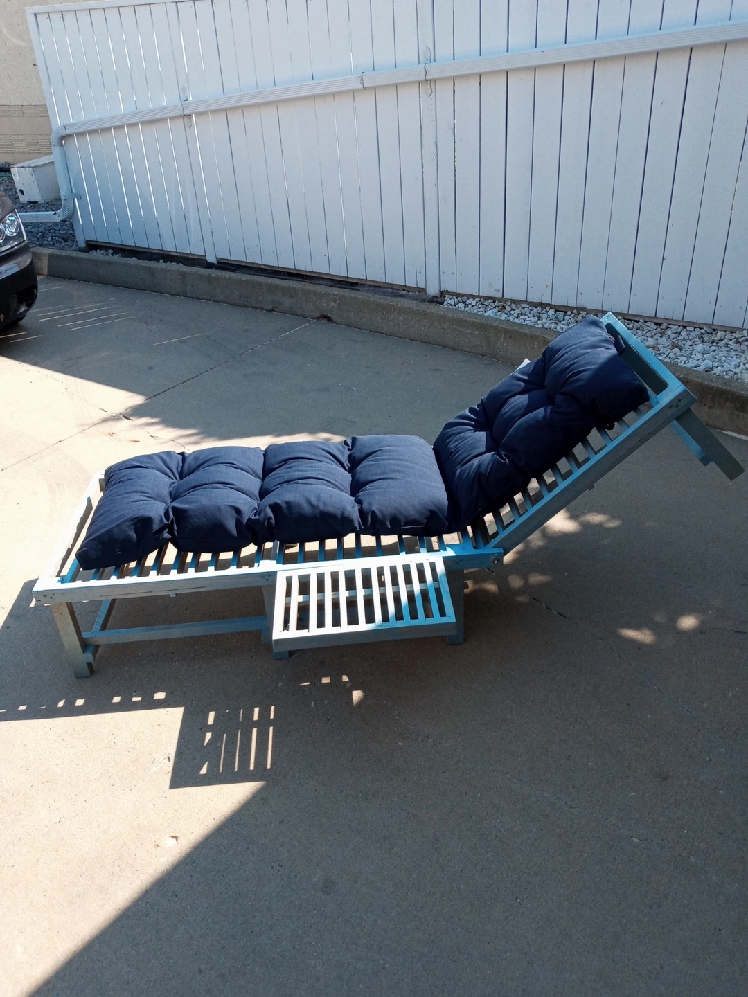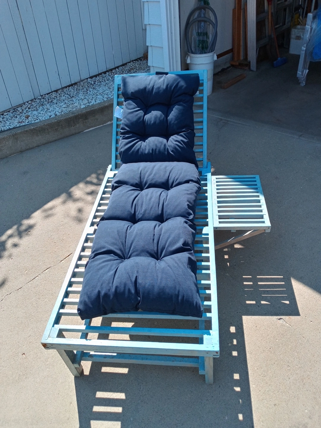 Selling a comfy outdoor lounge chair! It comes with nice blue cushions, perfect for relaxing on your patio or by the pool. It's in great shape and ready for a new home. Get ready to enjoy the summer sun!