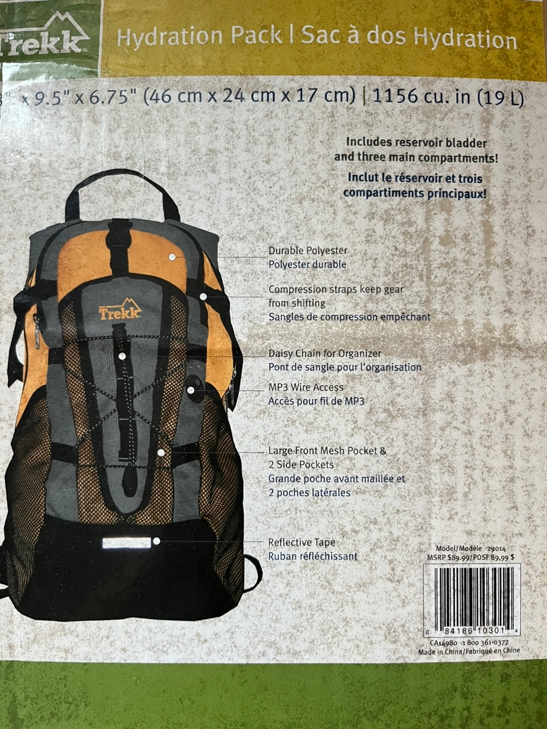 Selling 2 new Trekk Hydration backpacks. It includes a reservoir bladder and three main compartments.