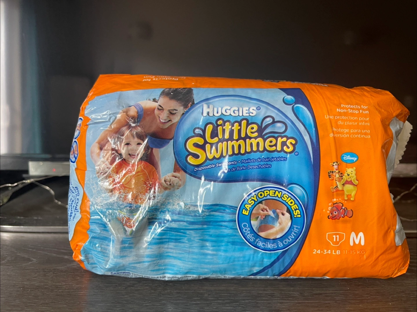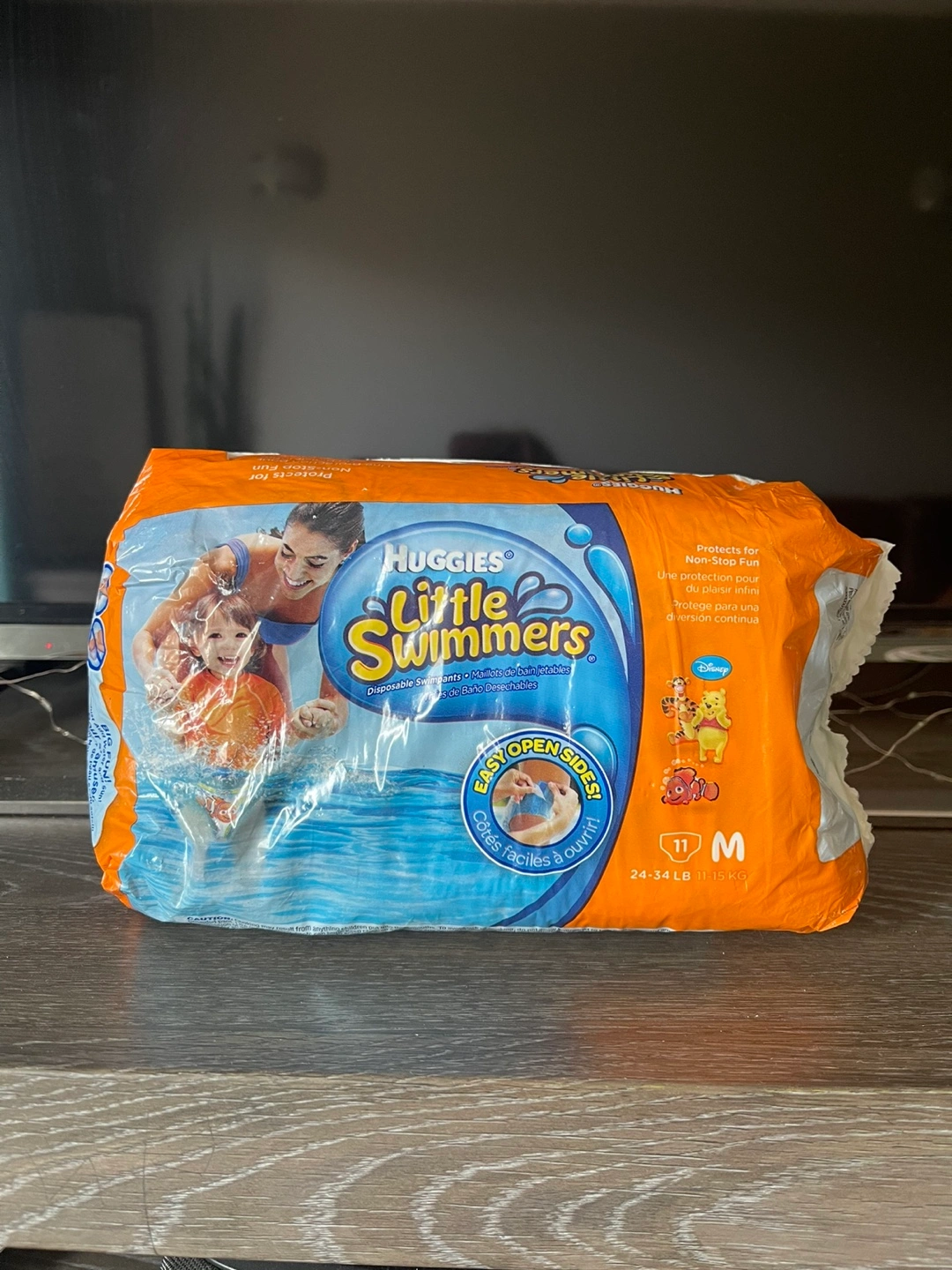 Selling a pack of Huggies Little Swimmers disposable swim diapers in size M, perfect for little ones weighing 24-34 lb (11-15 kg). These swim diapers have easy open sides for quick changes and are designed for fun in the water. They feature a cute Disney design with Winnie the Pooh and friends!