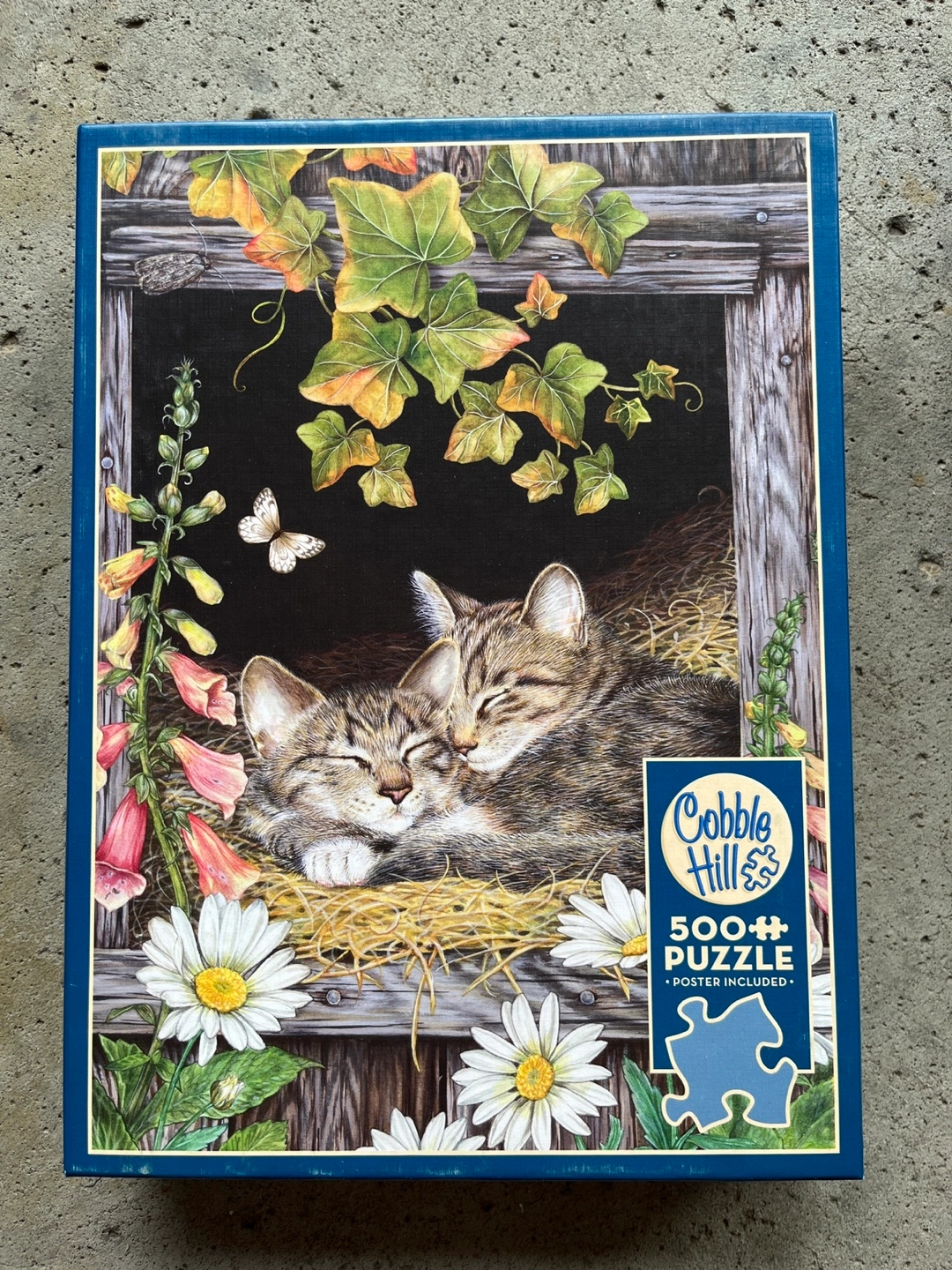 Selling a Cobble Hill puzzle with a sweet picture of kittens in a window! It's a 500+ piece puzzle, and a poster is included to help you assemble it.
