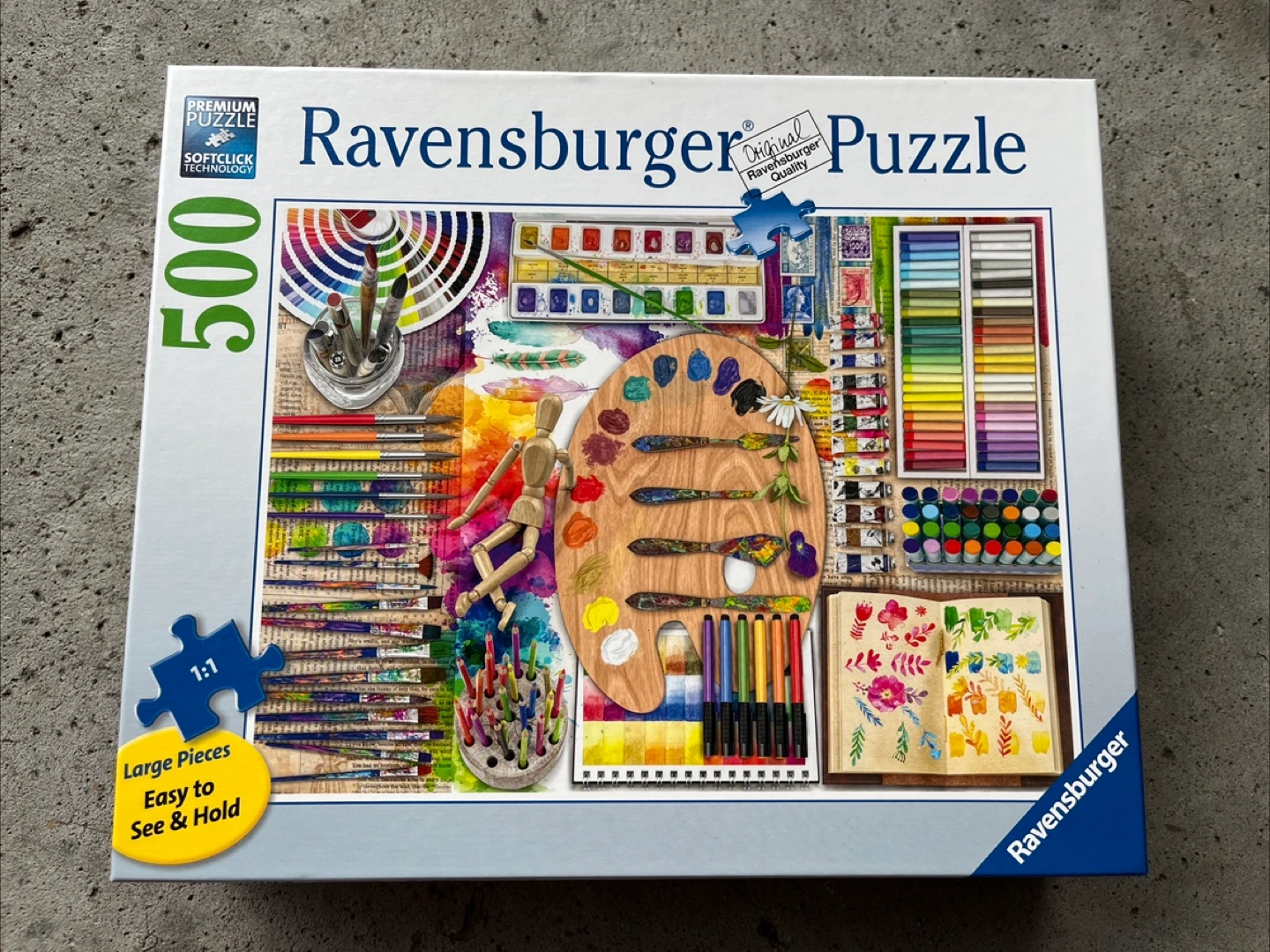 Selling a Ravensburger 500 piece puzzle! It features a lovely art theme with lots of colourful details. The puzzle has large pieces, making it easy to see and hold. It also has premium softclick technology. Perfect for puzzle enthusiasts!