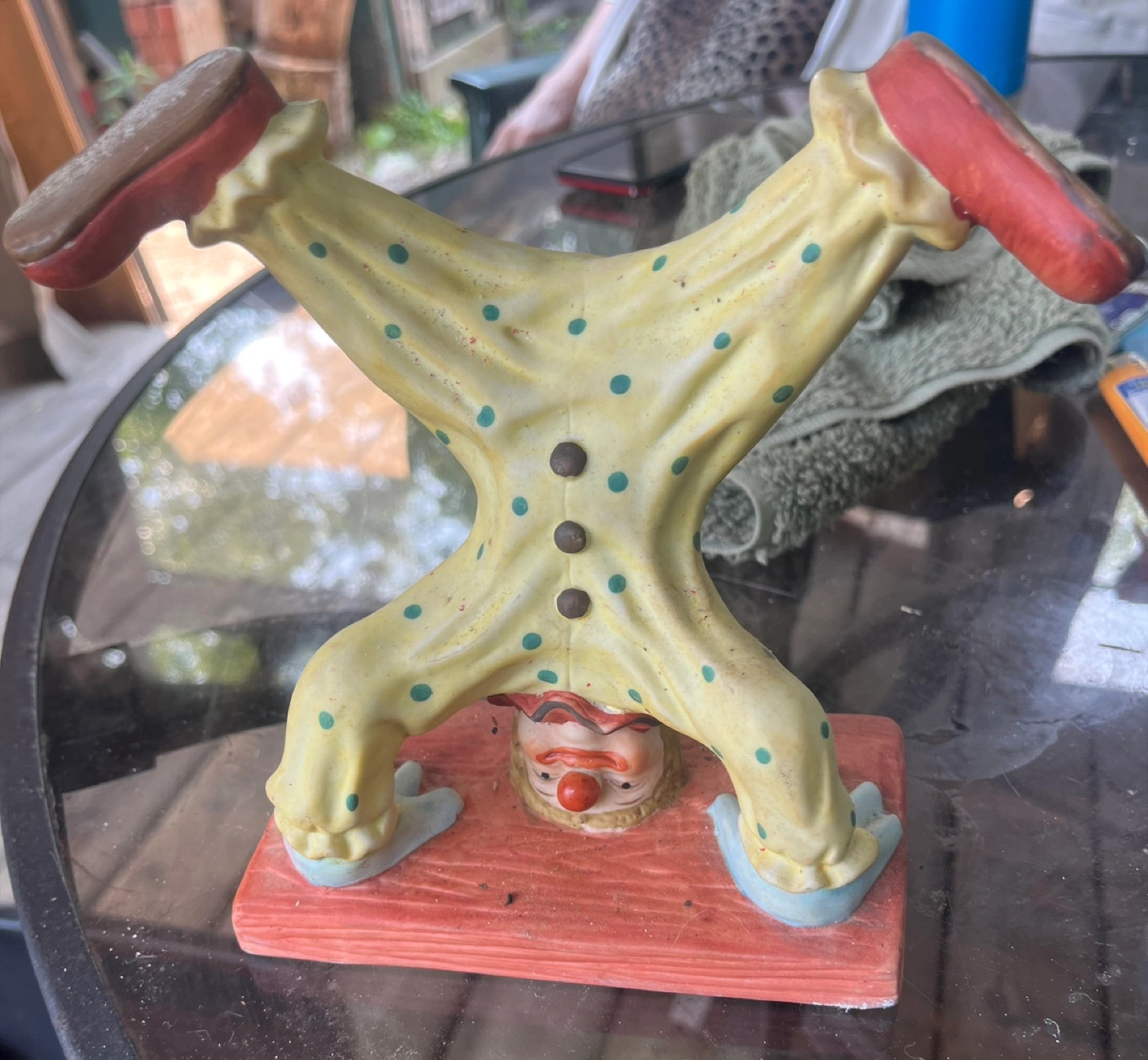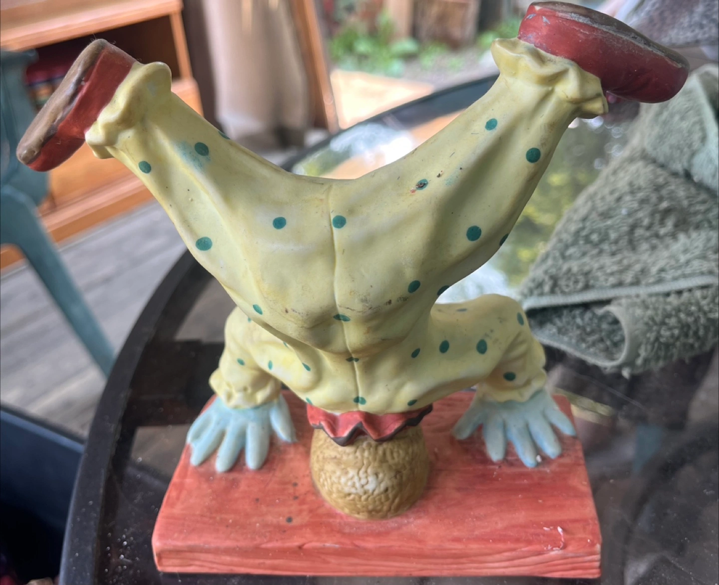 The clown is wearing a yellow suit with green polka dots and red shoes. It would look great on a shelf or desk