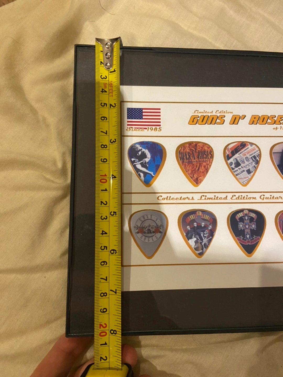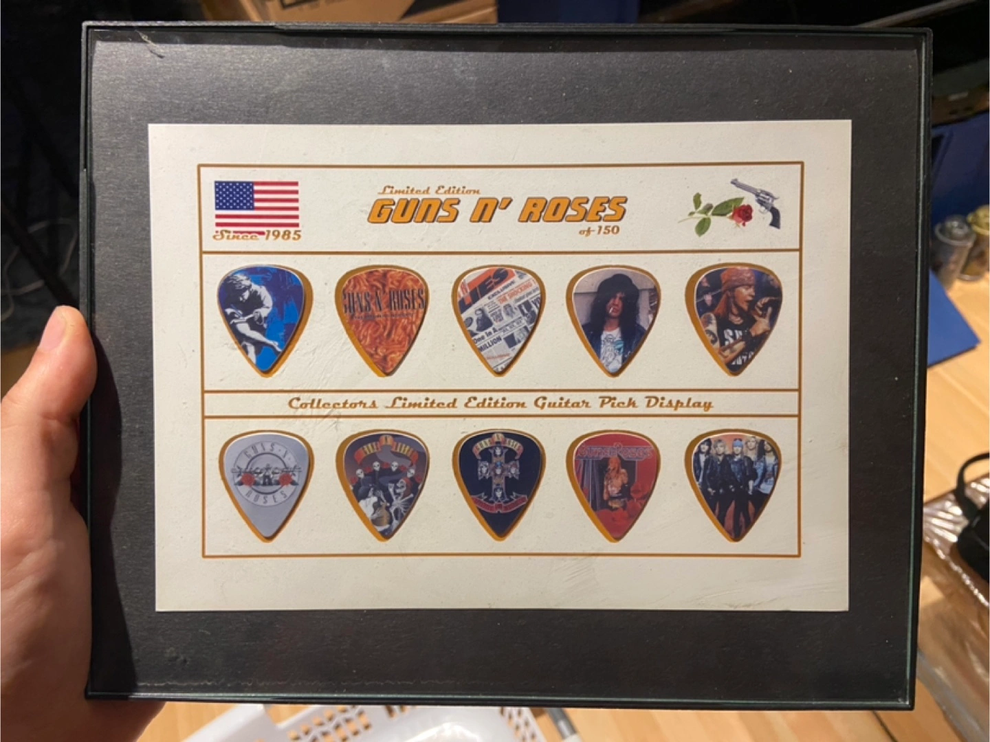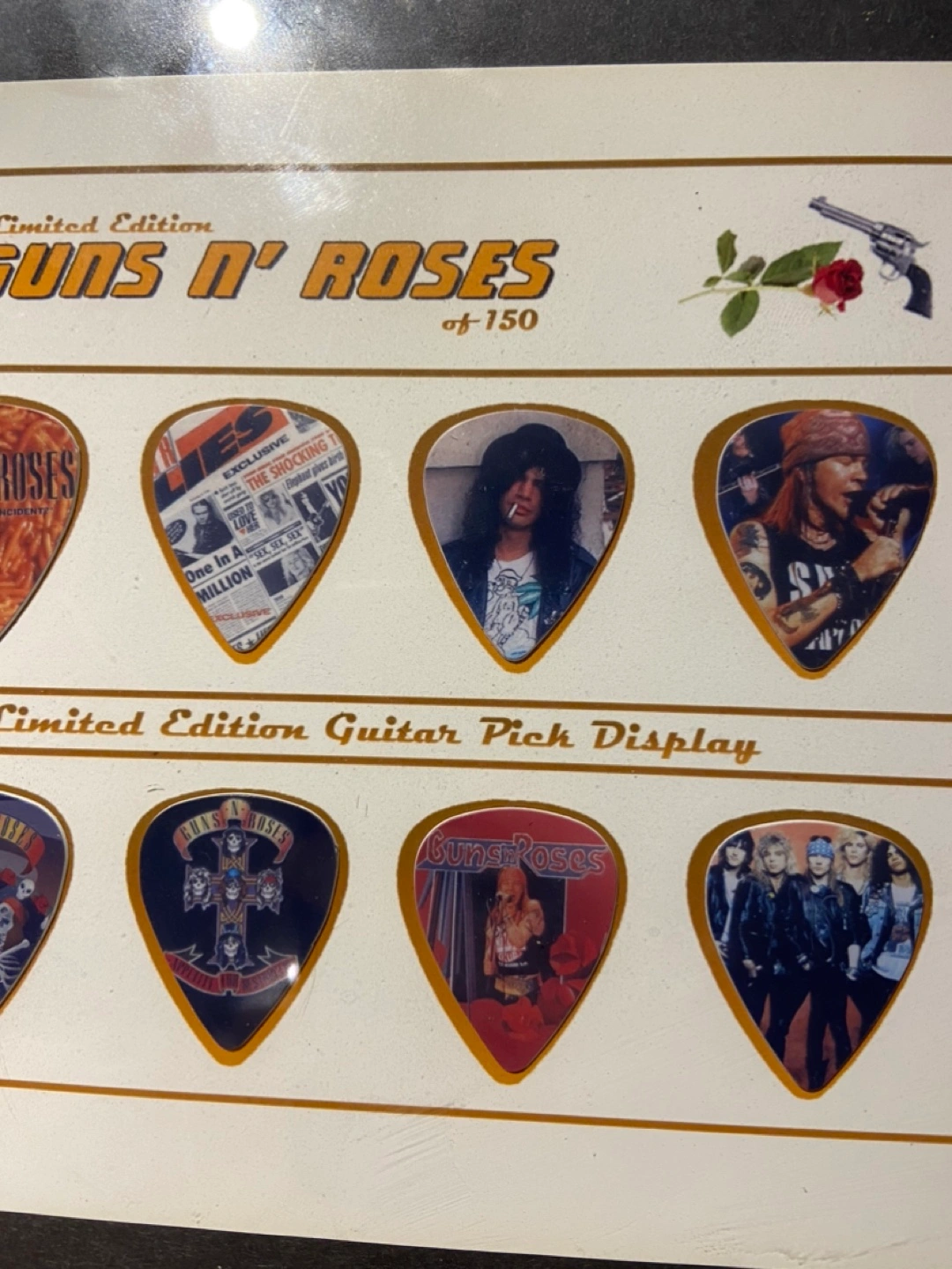 Selling a limited edition Guns N' Roses guitar pick display! It's a collector's item featuring a set of unique guitar picks. The display is plastic and glass framed and ready to hang. A cool piece for any music enthusiast or Guns N' Roses fan!