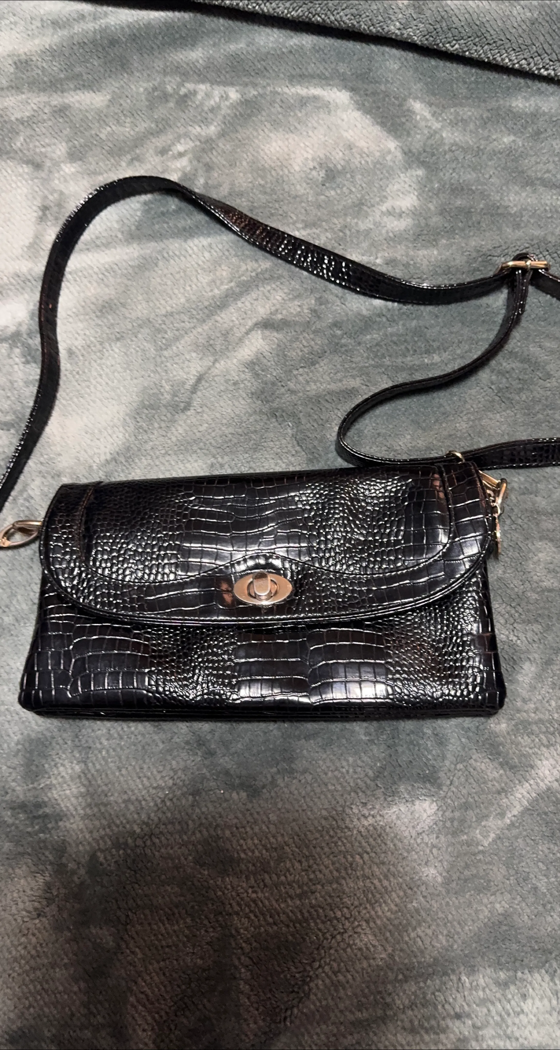 Selling a stylish black crossbody bag with a croc-embossed texture. It's perfect for adding a touch of elegance to any outfit. The bag features a sleek design and a convenient crossbody strap for easy carrying. It's in great condition and ready for a new home