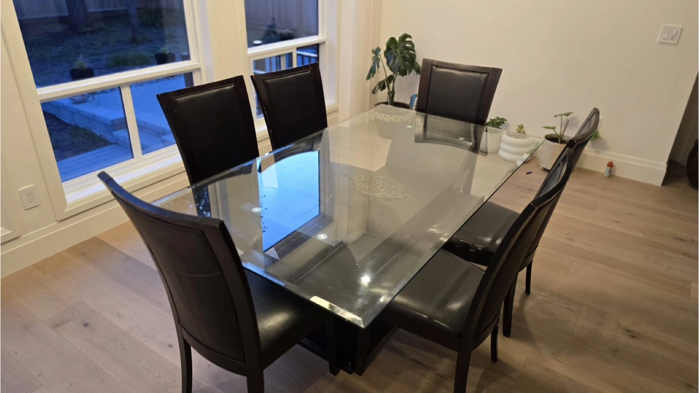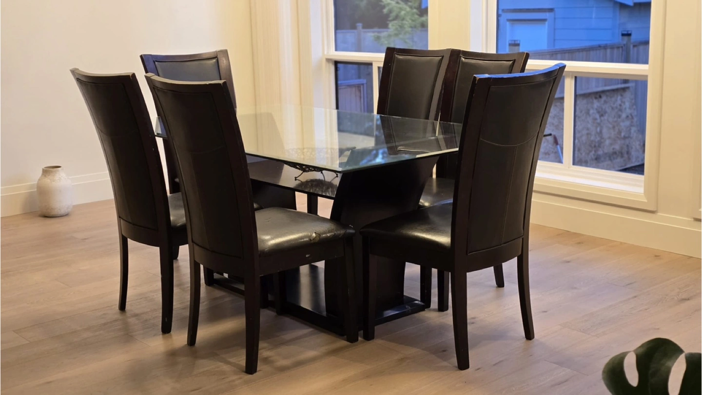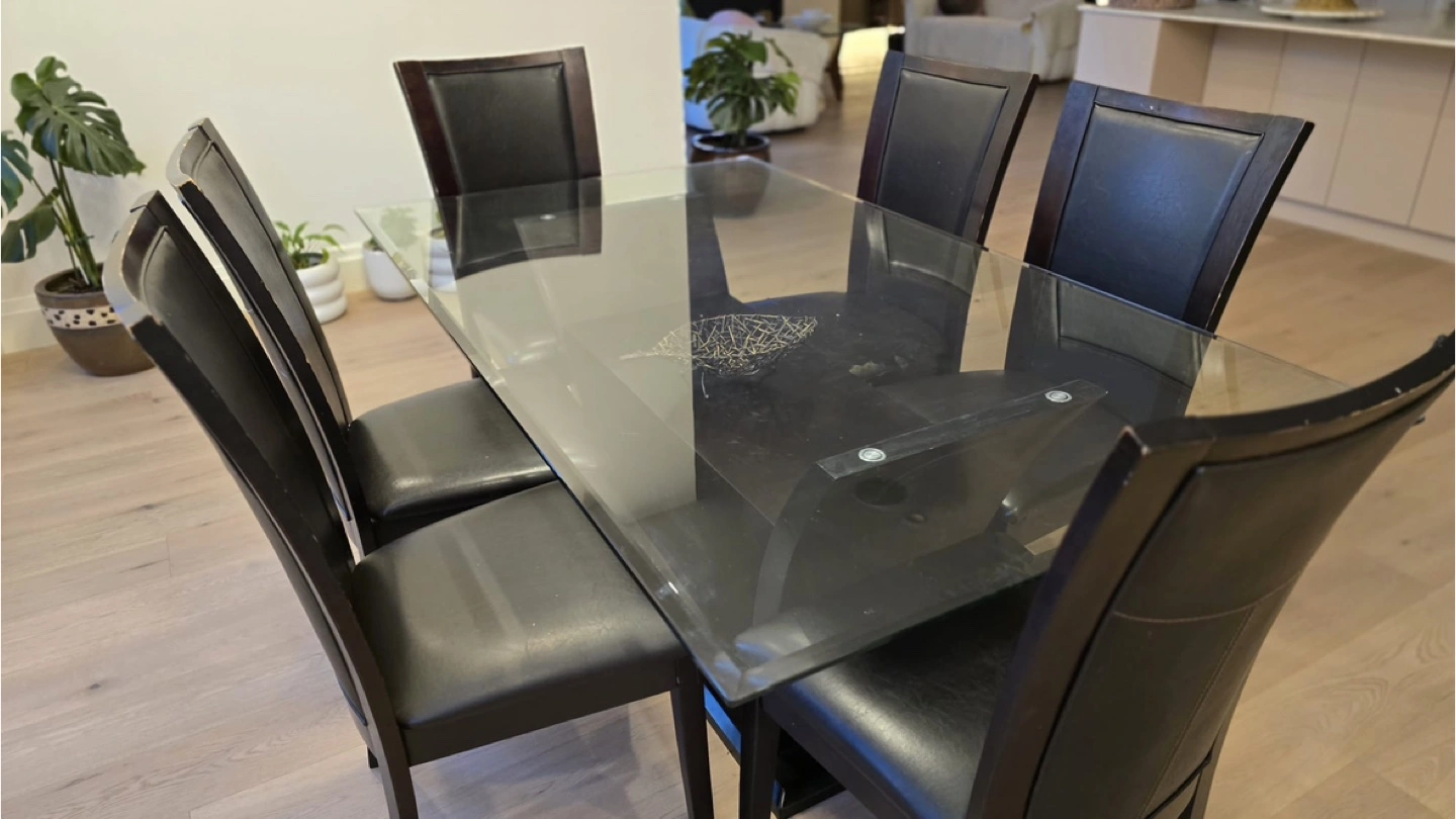 Selling a dining table with a glass top and six chairs. The chairs have a dark wood frame and black leather seats. Perfect for a dining room or large kitchen!