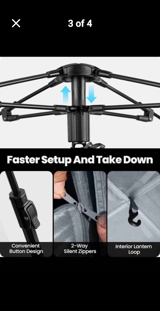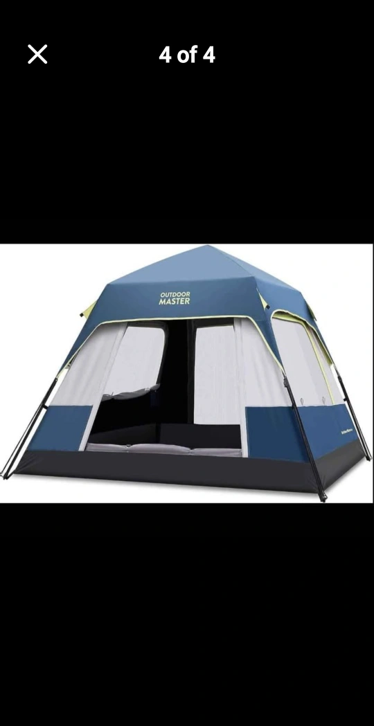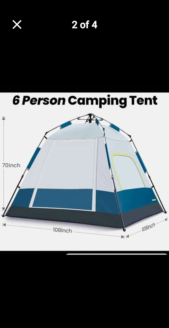 This is an Outdoor Master camping tent that fits up to 6 people! It's easy to set up and take down, with a convenient button design and 2-way silent zippers. It also features an interior lantern loop for your convenience! Dimensions are 70 inches tall and 108 inches wide.