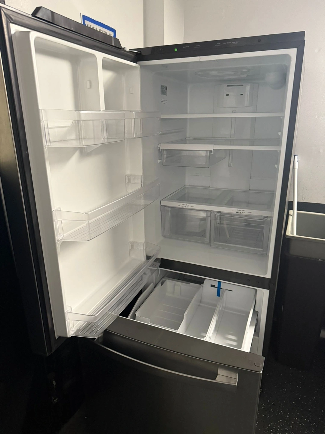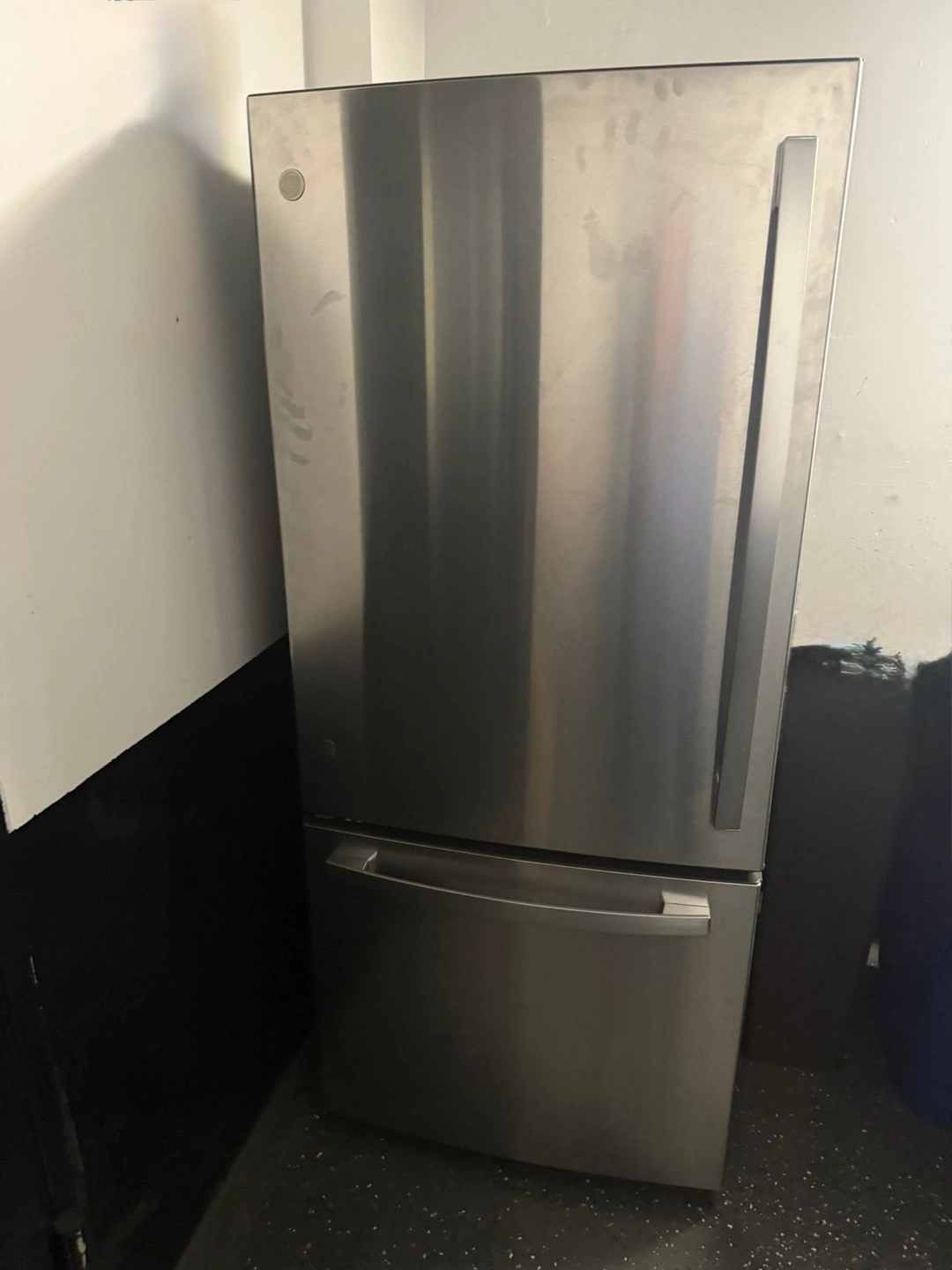 Selling a GE refrigerator in stainless steel. It's in good condition and ready to keep your food fresh! It features adjustable shelves and drawers for flexible storage options