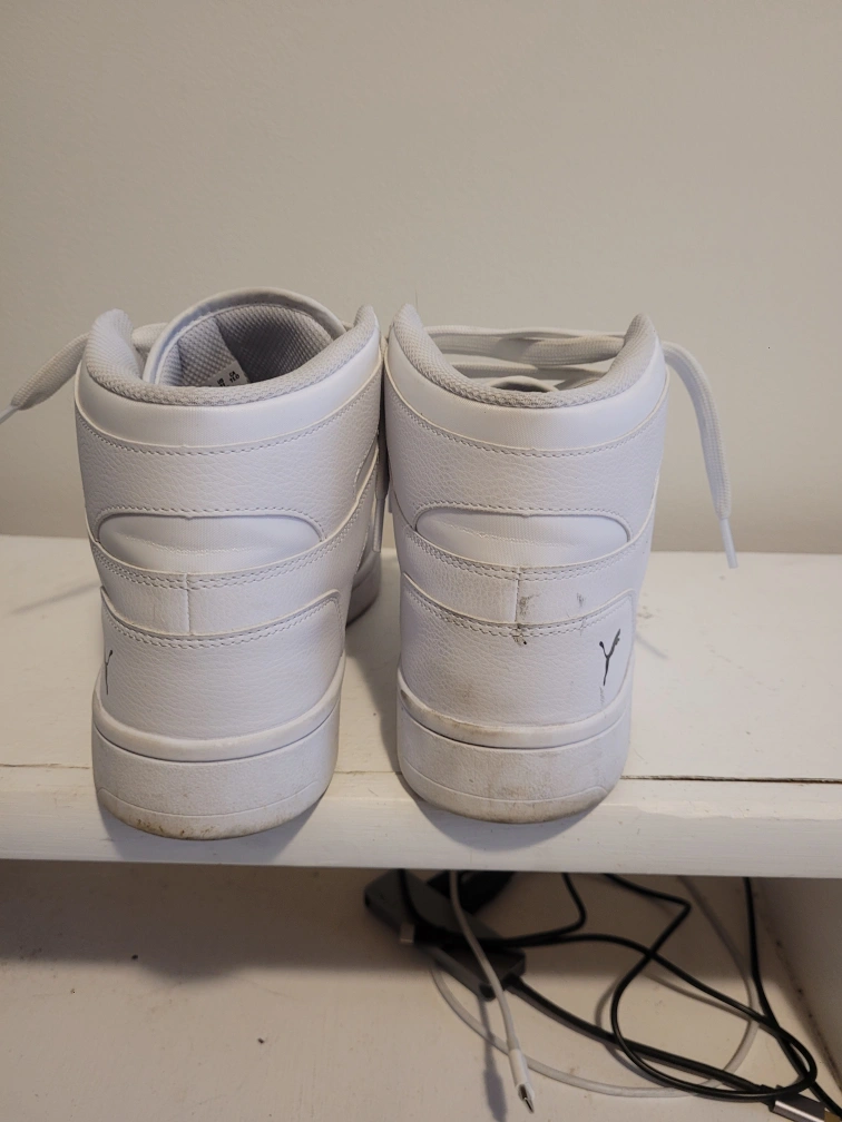 Selling a pair of Puma Rebound Joy high-top sneakers in white. They're in good condition and ready for a new home! These sneakers are stylish and comfortable, perfect for everyday wear. Warning, these shoes fit very slim. not great if you have wide/large feet